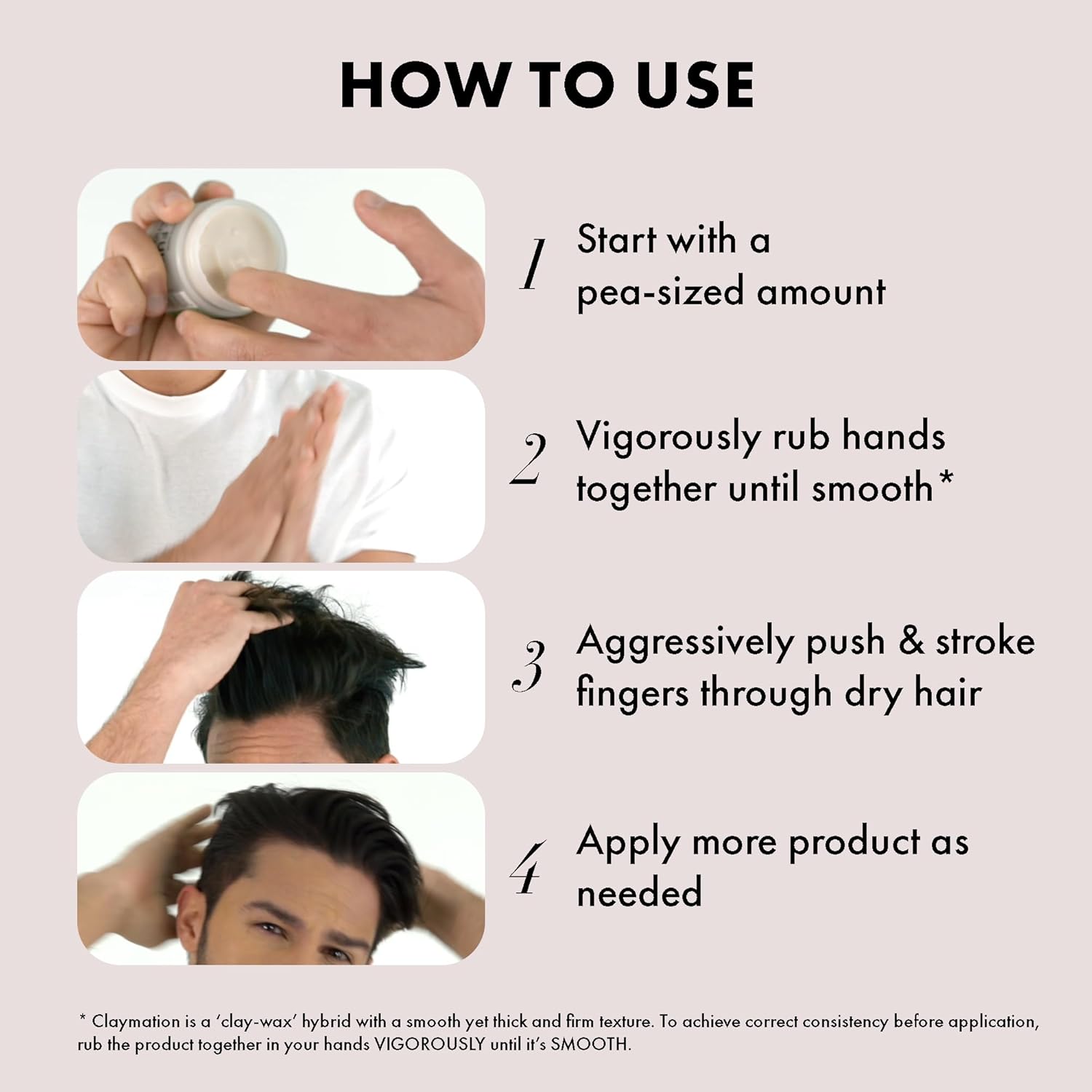 - Easy to Apply, Lasts All Day, Rinses out Clean: Start with a pea sized amount and spread it evenly across one of your palms. Then vigorously rub your hands together to activate and warm the product. Once the clay is smooth, aggressively push and stroke your fingers through your dry hair until you get the relaxed, textured hairstyle desired.
