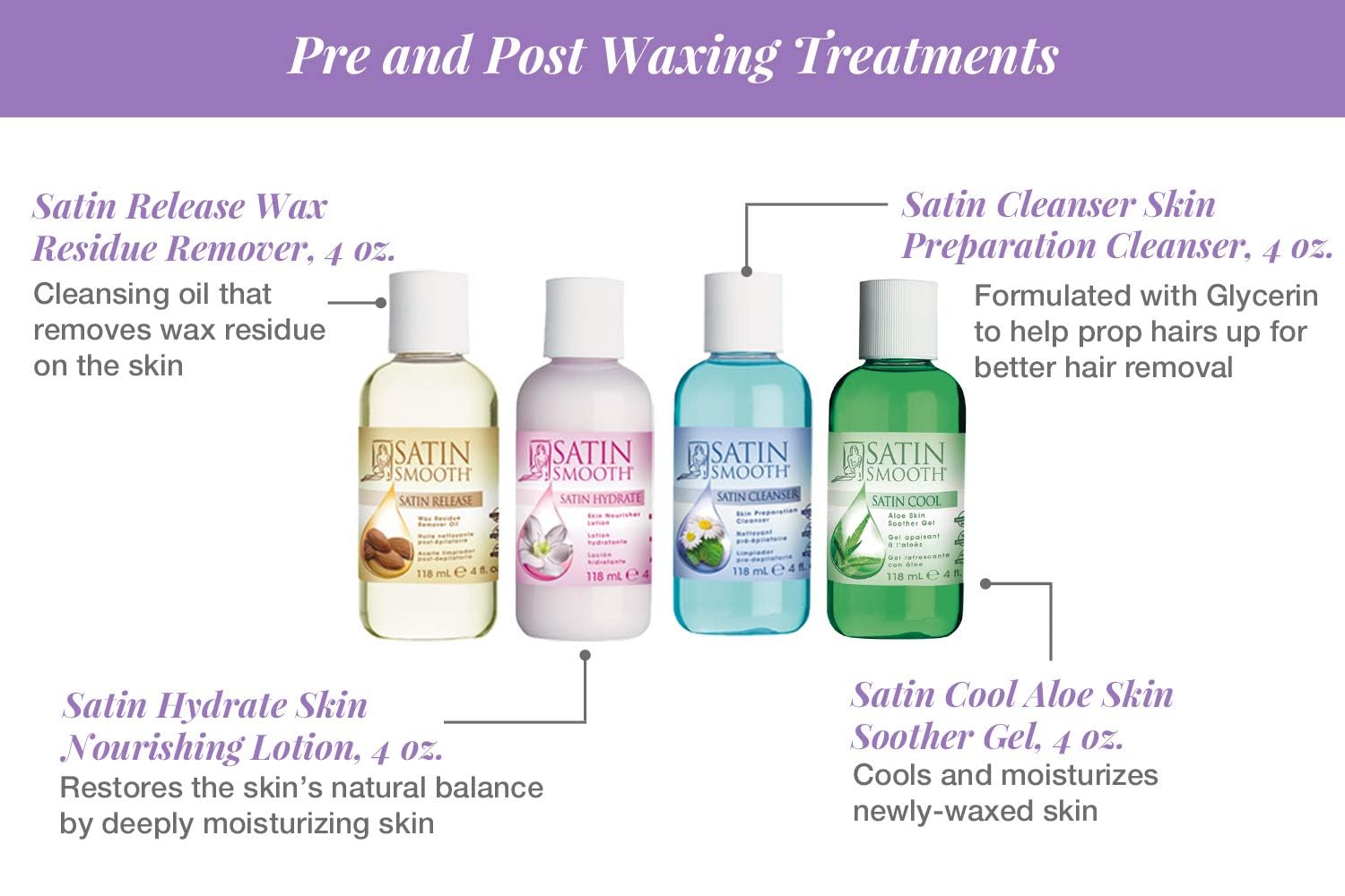 - PRE AND POST WAXING CARE FOR SATIN SMOOTH SKIN: Satin Smooth Pre and Post Wax Treatments effectively reduce redness, bumps, or allergic reactions before and after waxing. Pre-wax care will remove excess oil and impurities, conditions the skin for hair removal, making your waxing experience a special one. While the after-wax treatment help to replenish, calm, and restore the skin. Go through a less painful, faster, and efficient waxing treatment with this kit from Satin Smooth!
