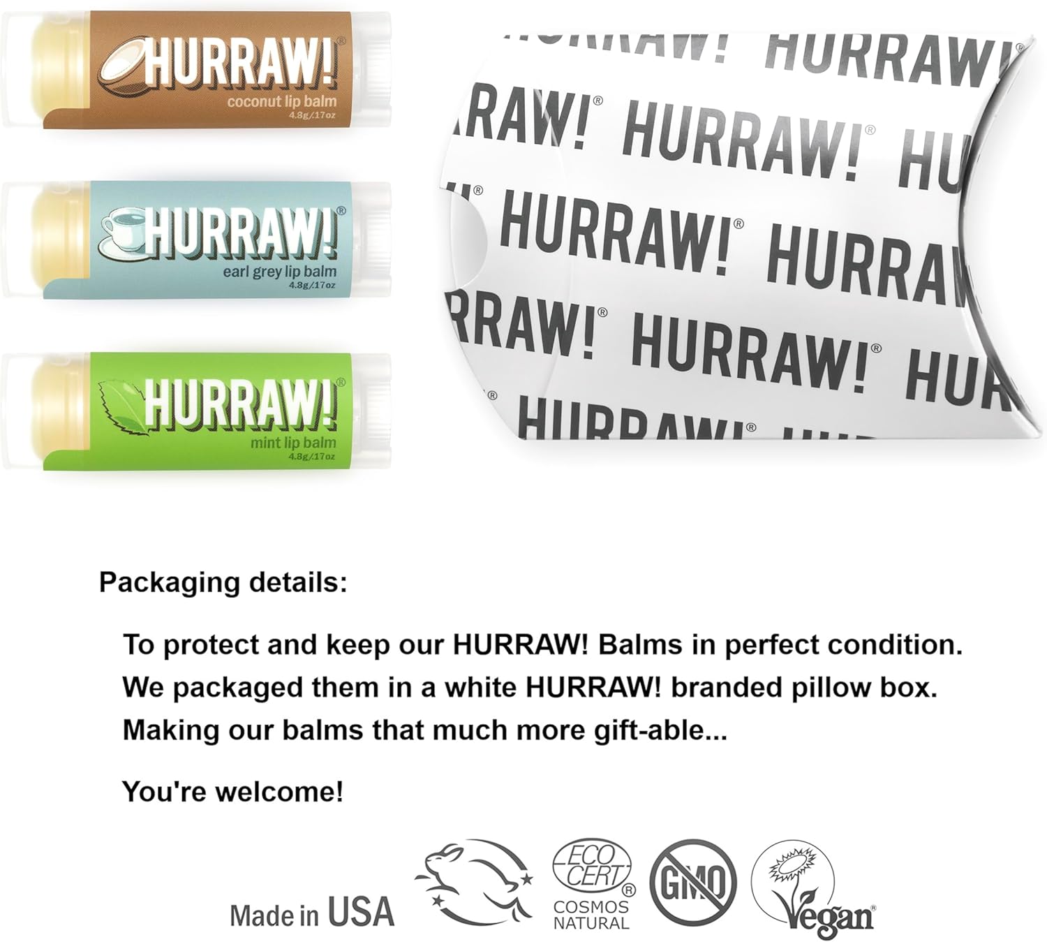 - THREE 4.8g/.17oz Oval Tubes of HURRAW! Lip Balm packaged in a white HURRAW! branded pillow box. COCONUT Balm (Raw Coconut Oil…. Not too beachy, a little toasty... coconut perfection), EARL GREY Balm (You'll be 'loving tea' all day long), MINT Balm (long lasting minty treat for your lips!). Made with certified organic, vegan, and raw ingredients. Hurraw! Lip Balms are certified 100% all natural origin, cruelty and gluten free. Non-GMO. Bee, Shea, Soy and Palm Free.