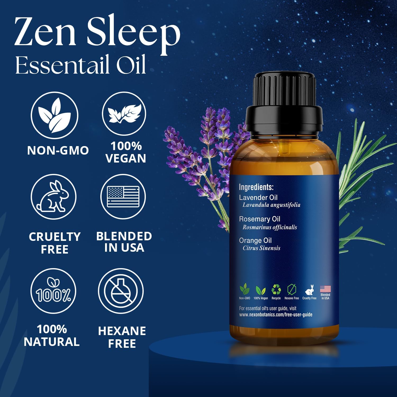 Zen Sleep Essential Oil Blend 30 ml - Lavender & Rosemary Relaxing Oil for Diffusers & Humidifiers - Calming Aromatherapy for Peaceful Sleep - Nexon Botanics