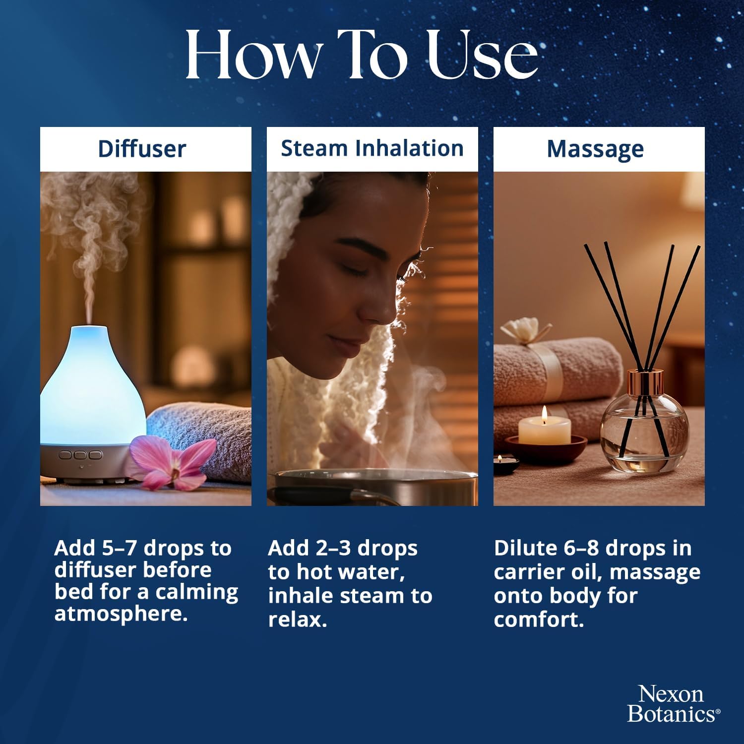 - Aromatherapy: This sleep essential oil can be used for aromatherapy and relaxation; Use in a diffuser or humidifier to help encourage a calm environment; Adding essential oil for sleep to the bath is a great way to unwind before bed.