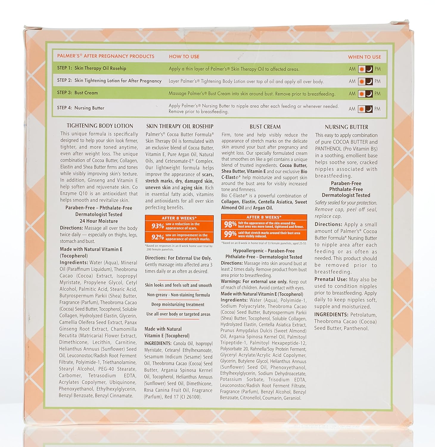 - New Mom Gift Set: Pamper the new mom with this 4 piece gift set of after pregnancy skincare essentials; This set includes Tightening Body Lotion, Nursing Butter, Bust Cream and Skin Therapy Oil to help firm and tone stretched skin