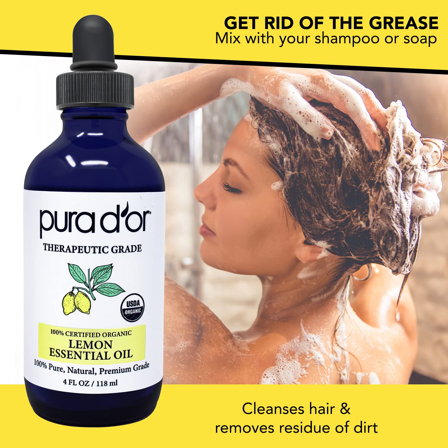 PURA D'OR Organic Lemon Essential Oil (4oz with Glass Dropper) USDA Certified 100% Pure & Natural Therapeutic Grade Diffuser Oil Citrus Scented for Aromatherapy, Mood Uplift, Energy, Focus