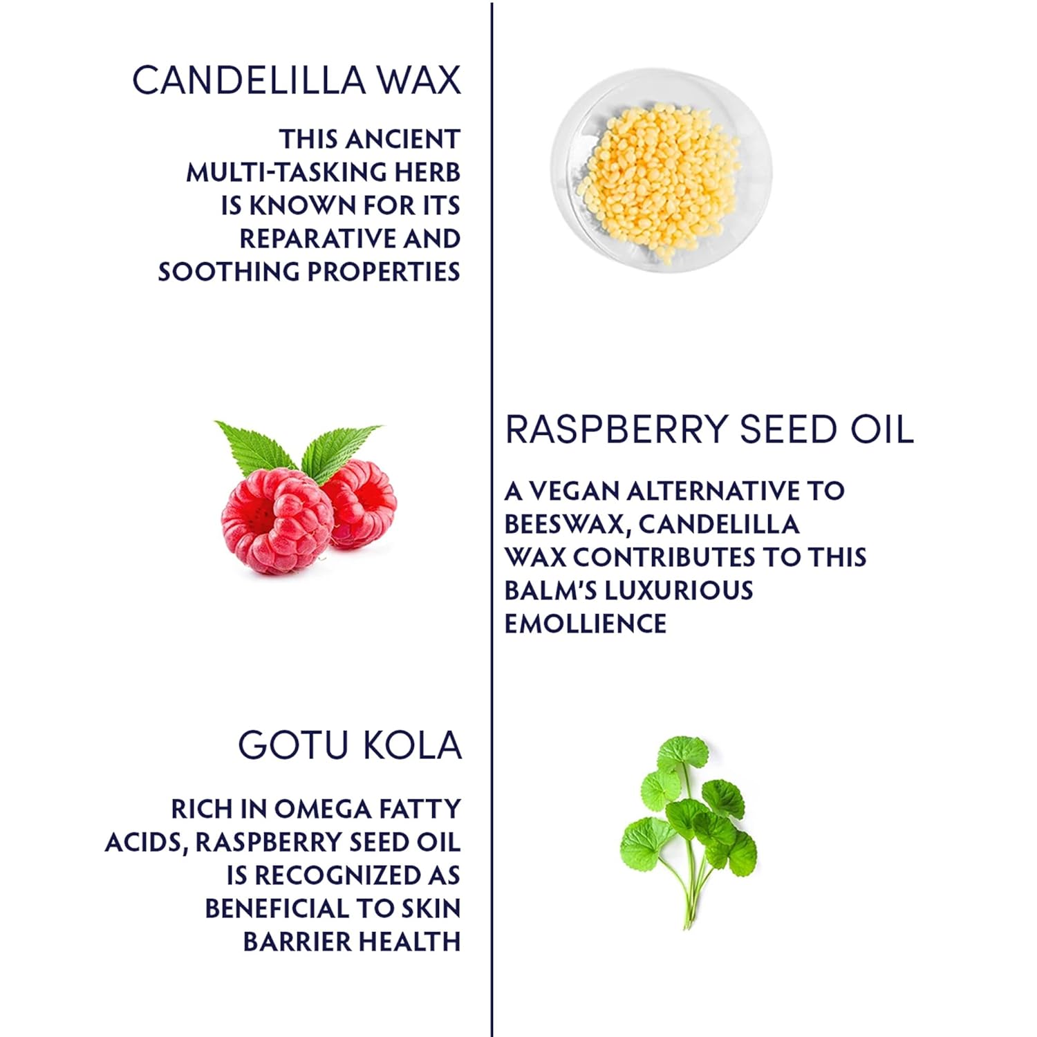 - Key Ingredients: Made with reparative Gotu Kola herb to help repair and soothe skin; calming Candelilla Wax; and omega fatty acid-rich Raspberry Seed Oil to support skin barrier health.