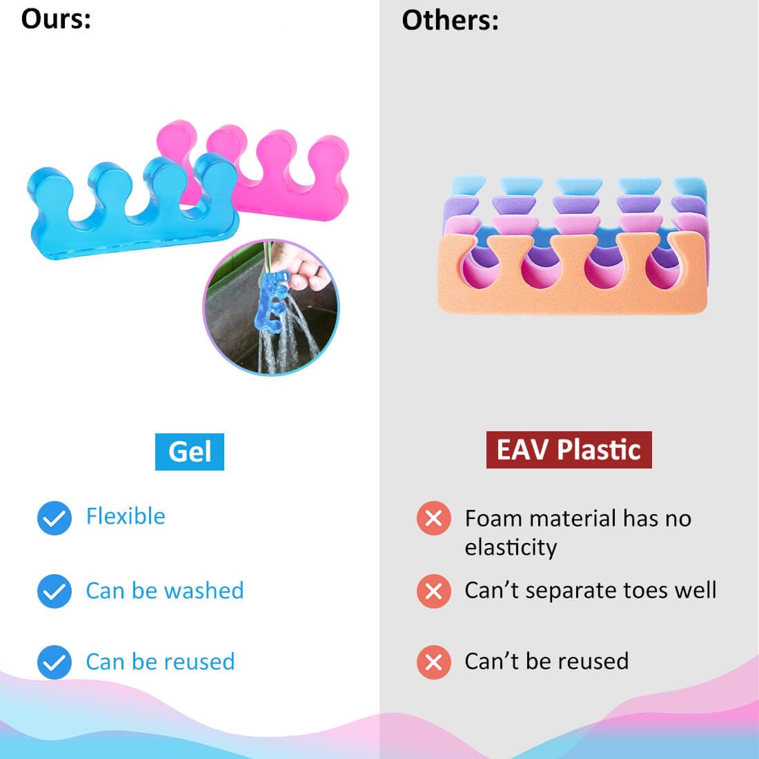 - đăReusableă: Foam toe spacers enhanced edition,toe separators gel can be repeatedly cleaned and soak in the water for a long time,is not deformed in quality after repeated usage.Please wash pedicure separators with clean water before using.