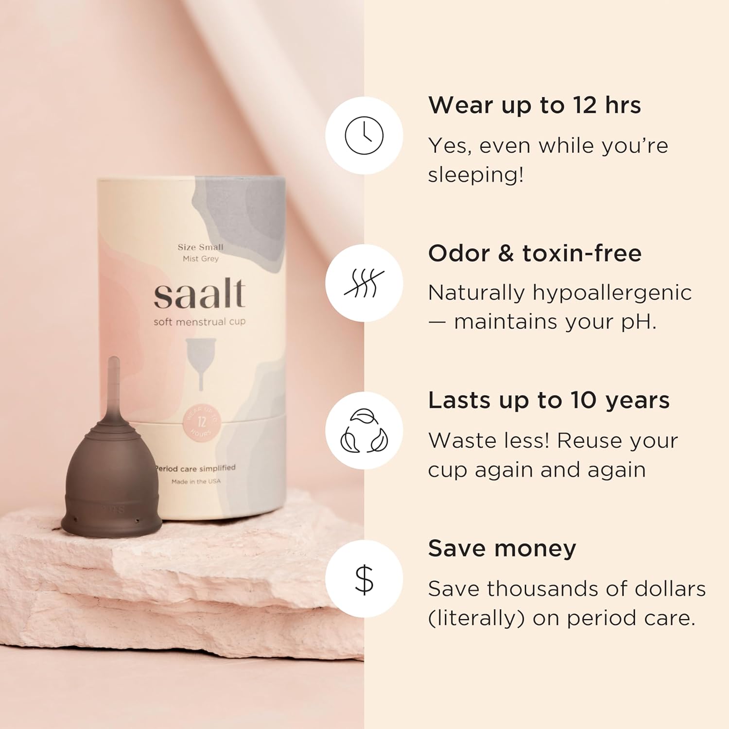 Saalt Soft Menstrual Cup – Reusable Period Cup – Made for Comfortable, Leak-Free Protection Up to 12 Hours – BPA & Latex Free – Includes Cup & Carry Bag (Regular, Grey)