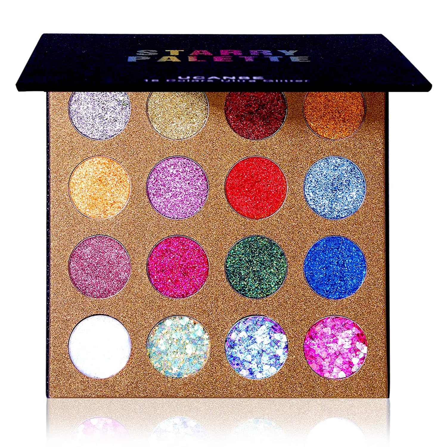 - UCANBE STARRY PALETTE includes 4 chunky glitter eyeshadows (GEL BASED) + 12 pressed glitter eyeshadows, each eye shadow can be used alone or mixed with matte eye shadow to make eyes more vivid and full of three-dimensional sense. Perfect for professional smoky eyes makeup, wedding makeup, party makeup or casual makeup.