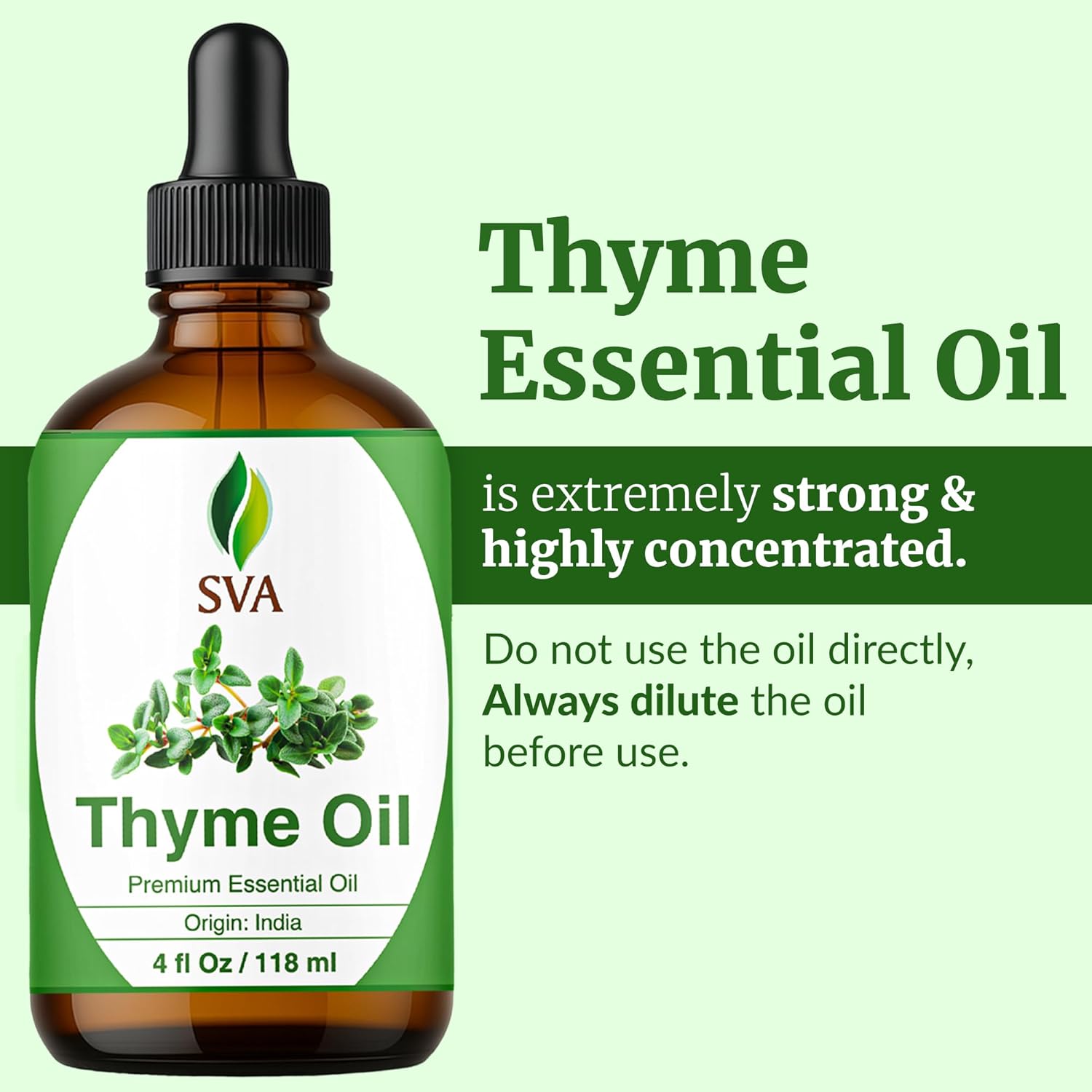 - Premium Quality Thyme Essential Oil: SVA Thyme Essential Oil 4oz is an essential oil and is obtained by steam distillation of Thymus vulgaris. Our Thyme oil is free of preservatives and comes with a dropper for easy application. It is not tested on Animals. We care for you!
