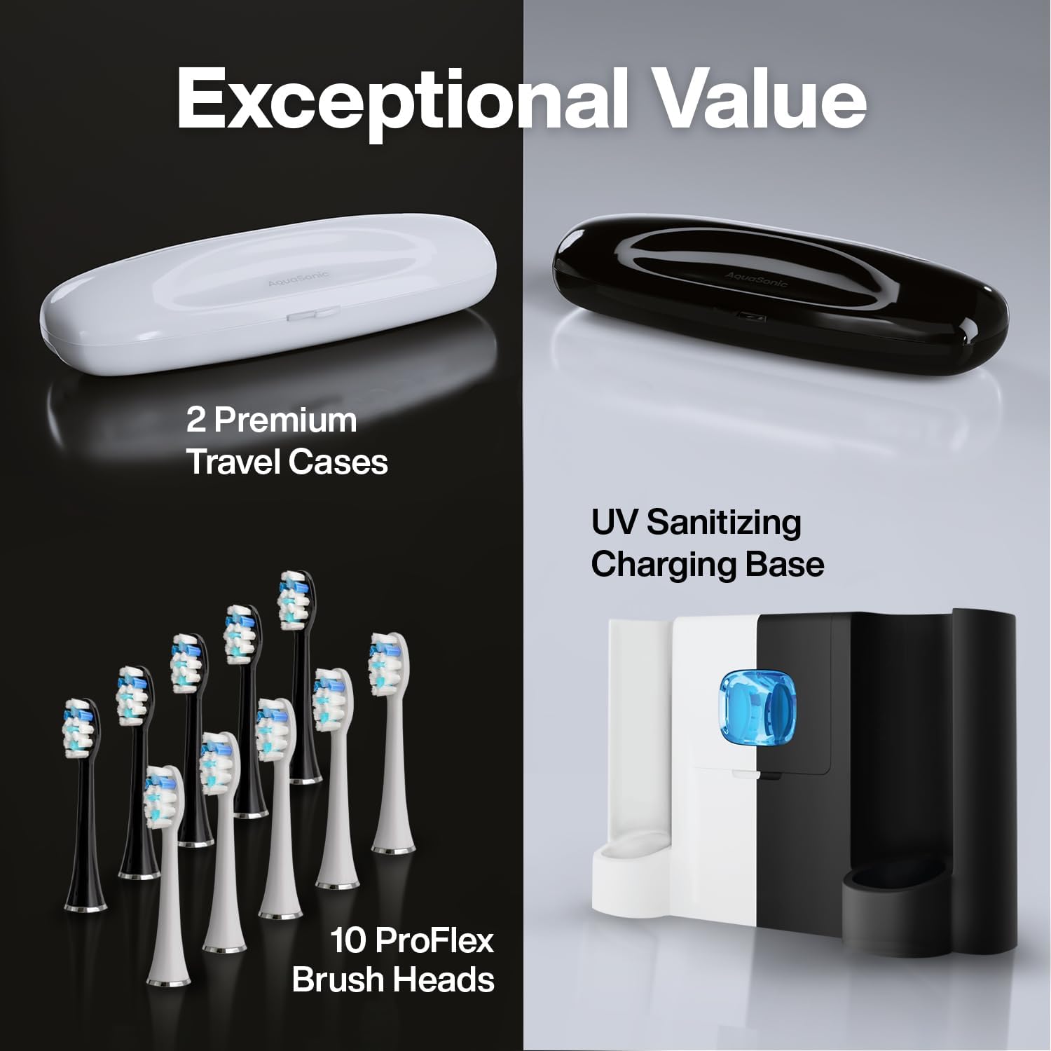 - Complete Oral Care Set: Includes 10 ProFlex replacement brush heads (lasting over a year for two users), 2 premium travel cases, and the dual-handle UV sanitizing and charging base â everything needed for a modern oral care upgrade.