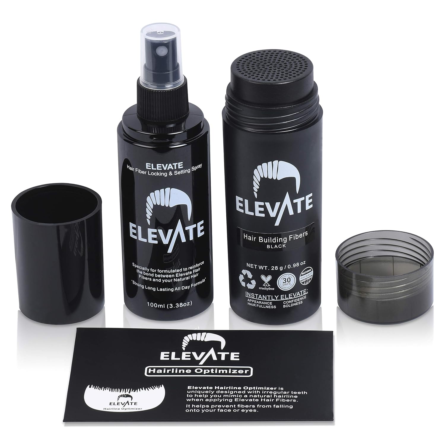 Elevate Hair Building Fibers 3-in-1 Kit for Thinning Hair (Black) Keratin Hair Thickening Powder with Fiber Lock Spray & Hairline Optimizer Comb - Instant Hair Concealer Waterproof for Men & Women