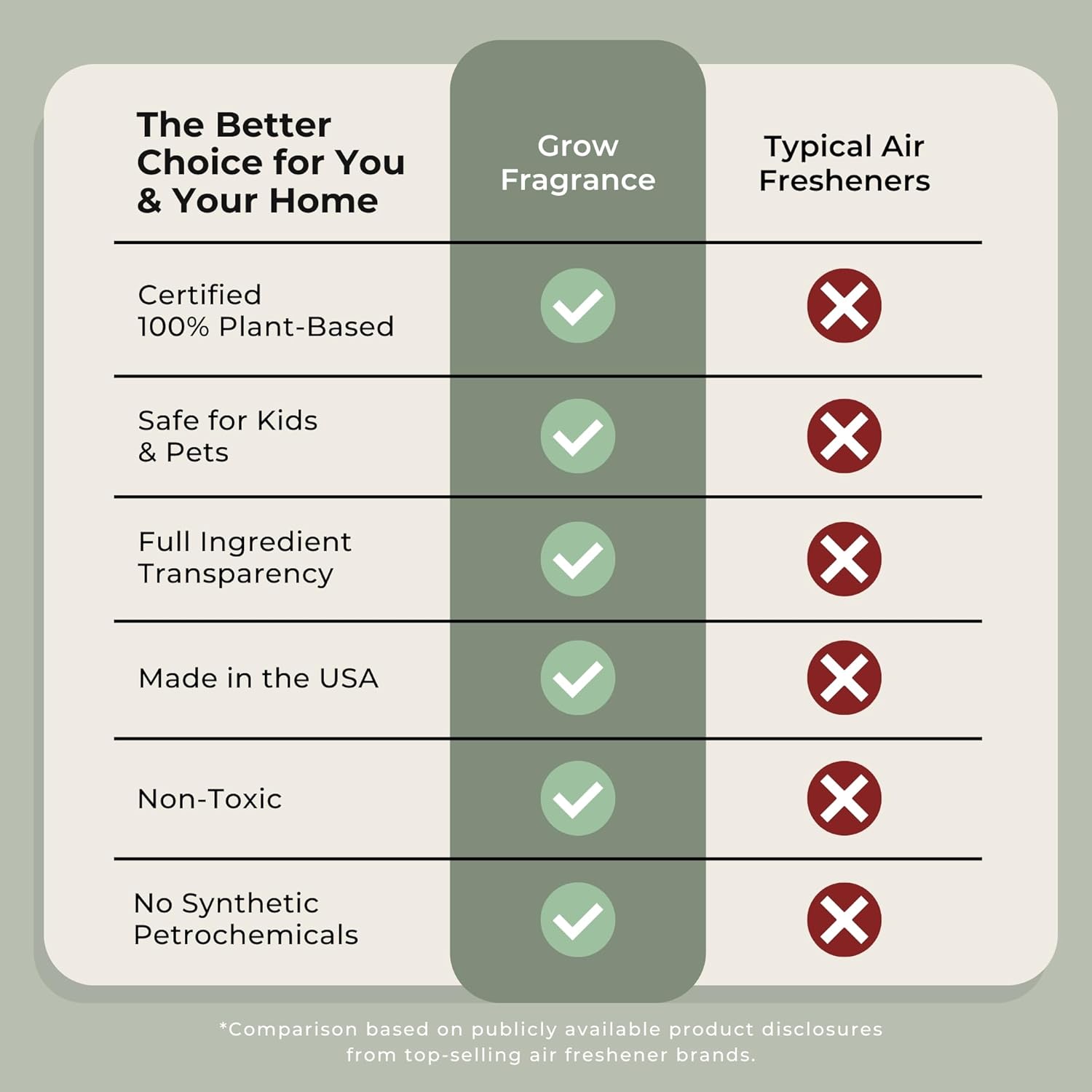 - In Pursuit of Natural Solutions: At Grow Fragrance, we began our mission with a simple desire for a natural, safe alternative to synthetic fragrances. Our sprays are free from toxins, parabens, and aerosols, ensuring a pure environment for your family and pets. With each spray, you'll experience the clean, refreshing scents of nature, without harmful chemicals.