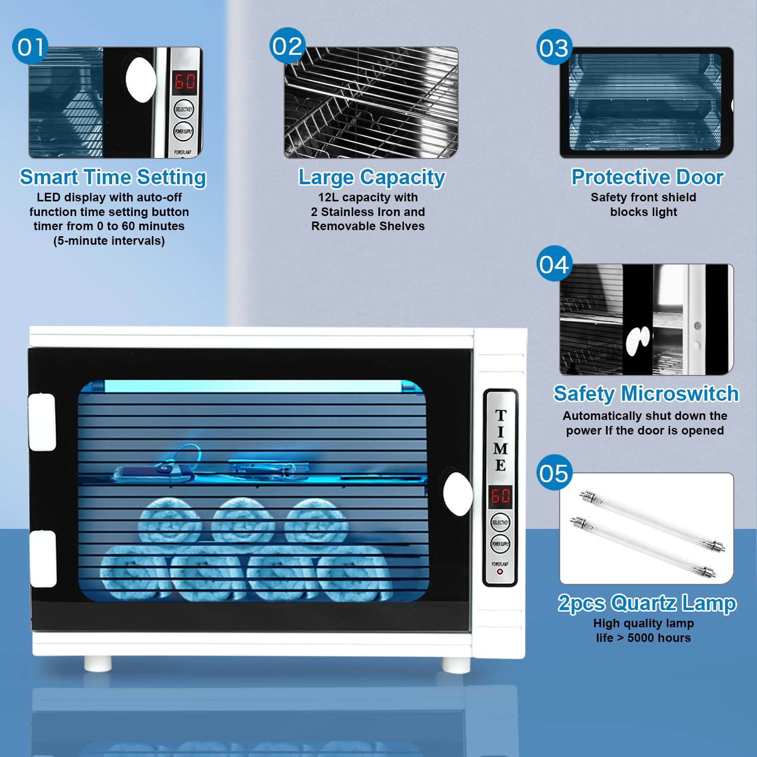- đăBuy with ConfidenceăOur cleaning cabinet is equipped with durable quartz lamps with a service life of up to 5000 hours. Packing list: Cleaning Cabinet *1, Lamp *2 (1 spare lamp), User Manual*1. There are four protective feet on the bottom of the tool cabinet to protect the table from being scratched by friction with the table. Order now to begin easily cleaning everyday objects! 1-year manufacturer warranty. Any issues or concerns, our team is here to help!