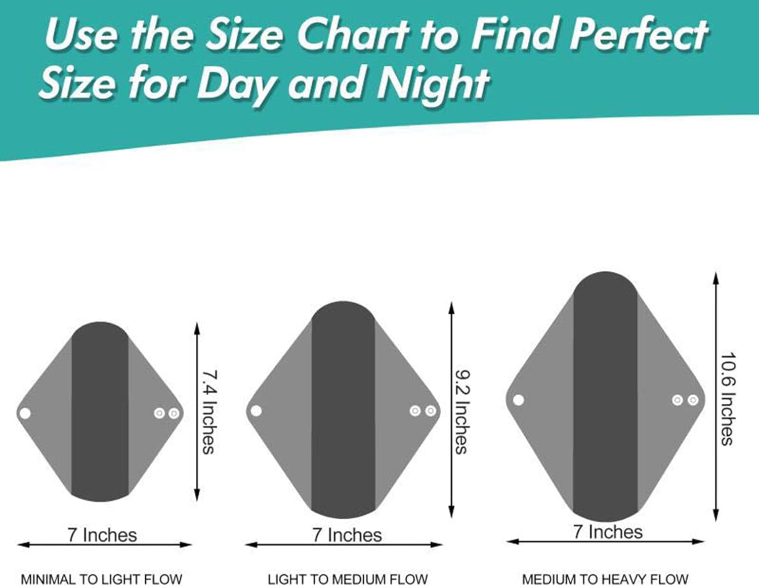 - 3 SIZE AVAILABLE - Leekalos Washable mentrual pads Small size 7.4inches Length X 7inches Width (including wings) ; Medium size 9.2 inches Length X 7.2 inches Width (including wings) ; Large size 10.6 inches Length X 7.2 inches Width (including wings).