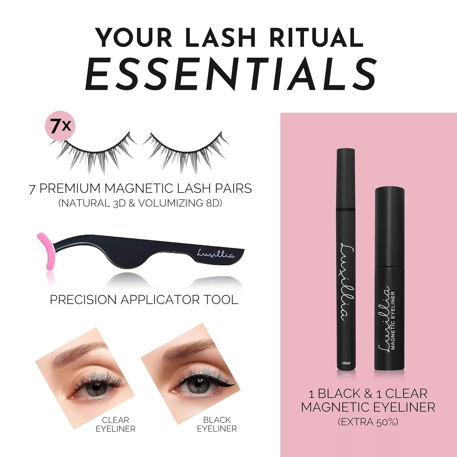 Luxillia Magnetic Eyelashes Kit – 10 Piece (Clear & Black) Magnetic Eyelash & Eyeliner Set with Applicator – Natural Look Easy Apply Reusable Fake Extension Lashes, No Glue – Pestañas Naturales