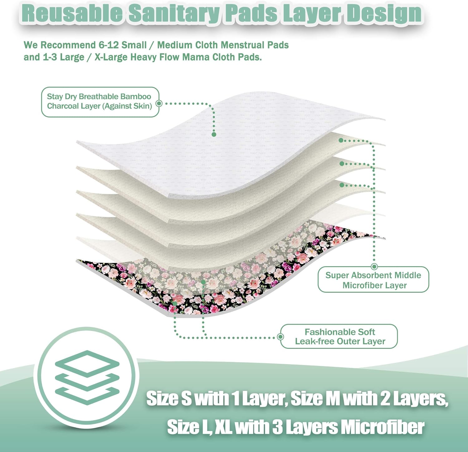 - Lovely Print Leak-free Outer of menstrual cloth pads and comfort of the softer, charocal layer against your skin. Great as reusable panty liners too. Fold over and snap into place. Never feel embarrassing
