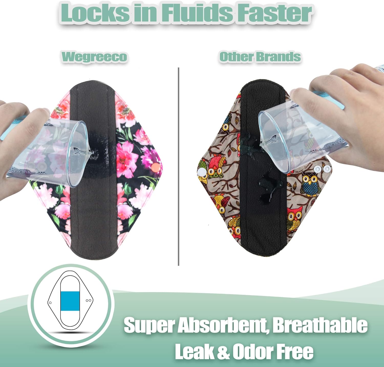 Wegreeco Reusable Menstrual Pads - Soft Cloth Sanitary Pads & Panty Liners - 6 Pack with 1 Cloth Mini Wet Bag (Large, Flower 02)