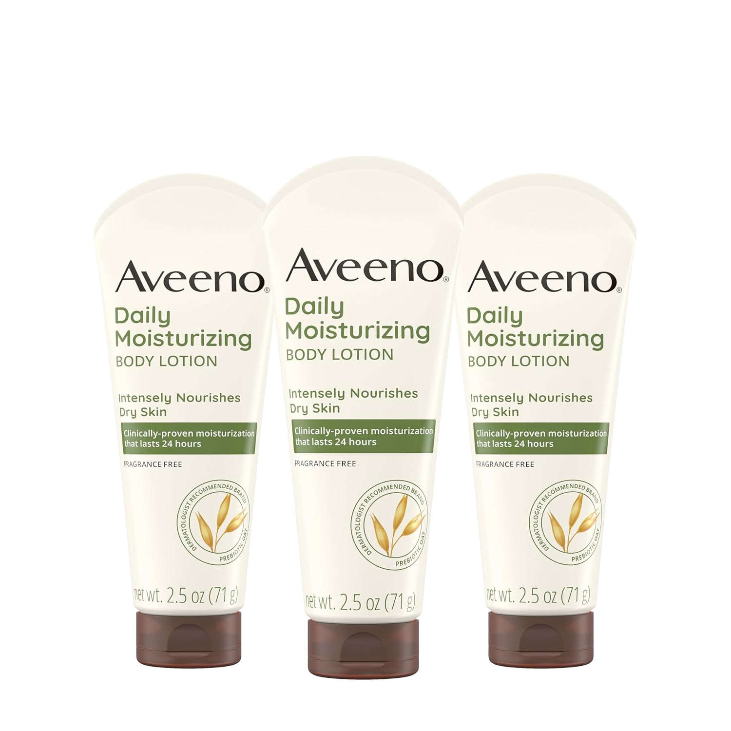 - Moisturizing body lotion: Value pack of three, 2.5-fluid ounce travel sized bottles of Aveeno Daily Moisturizing Fragrance Free Body Lotion for men & women to instantly strengthen the skin barrier with 48-hour moisturization