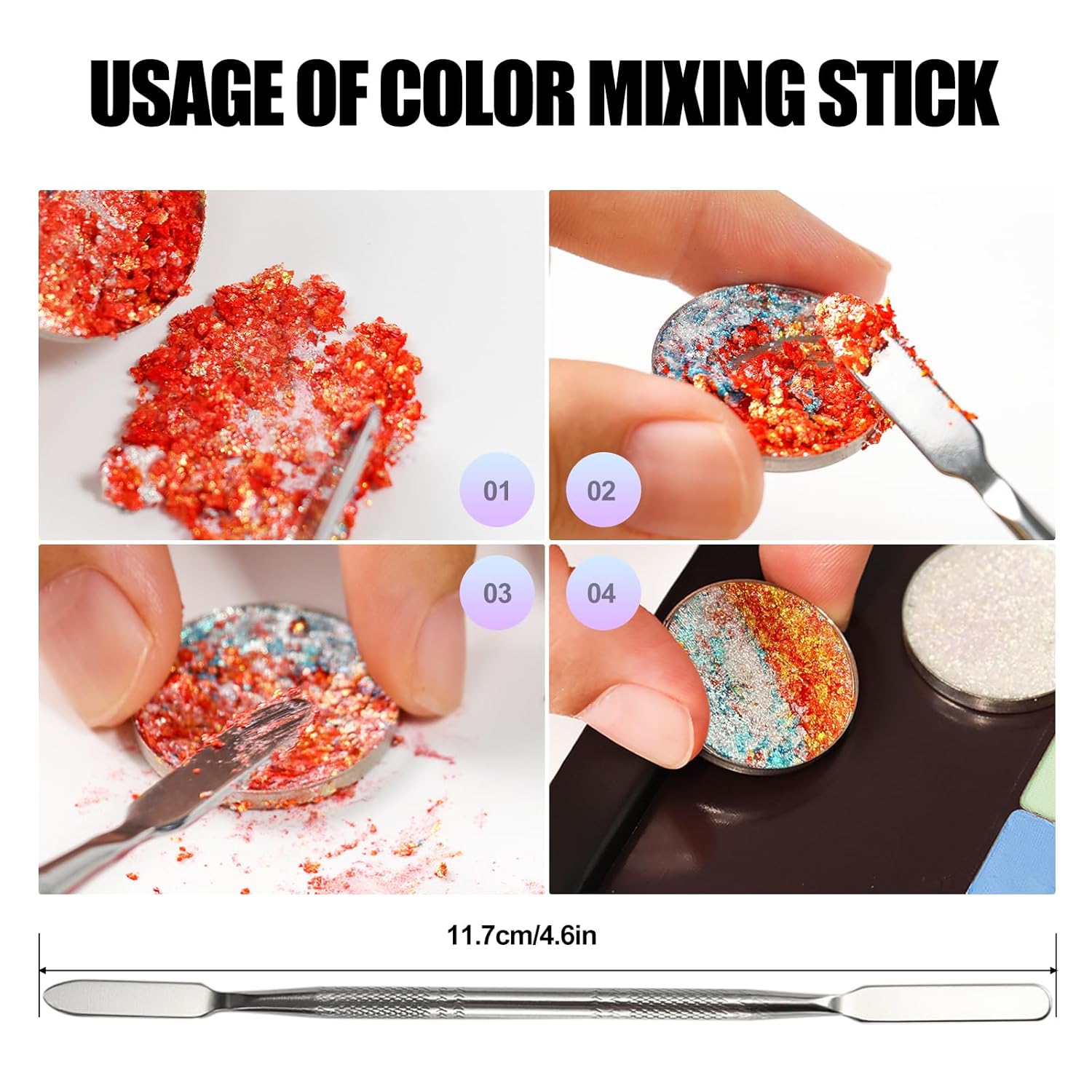 - Size detail: 18-Color Empty Palette: 7.2 x 4.0 x 0.5 inches (L x W x H, Rectangle),9-Color Empty Palette: 4.0 x 4.0 x 0.5 inches; Depotting Spatula: Approx. 6.2 inches; Rectangle Metal Stickers: 0.67 x 0.55 inches (L x W); Round Palette Sticker: 1.0 inch in diameter.