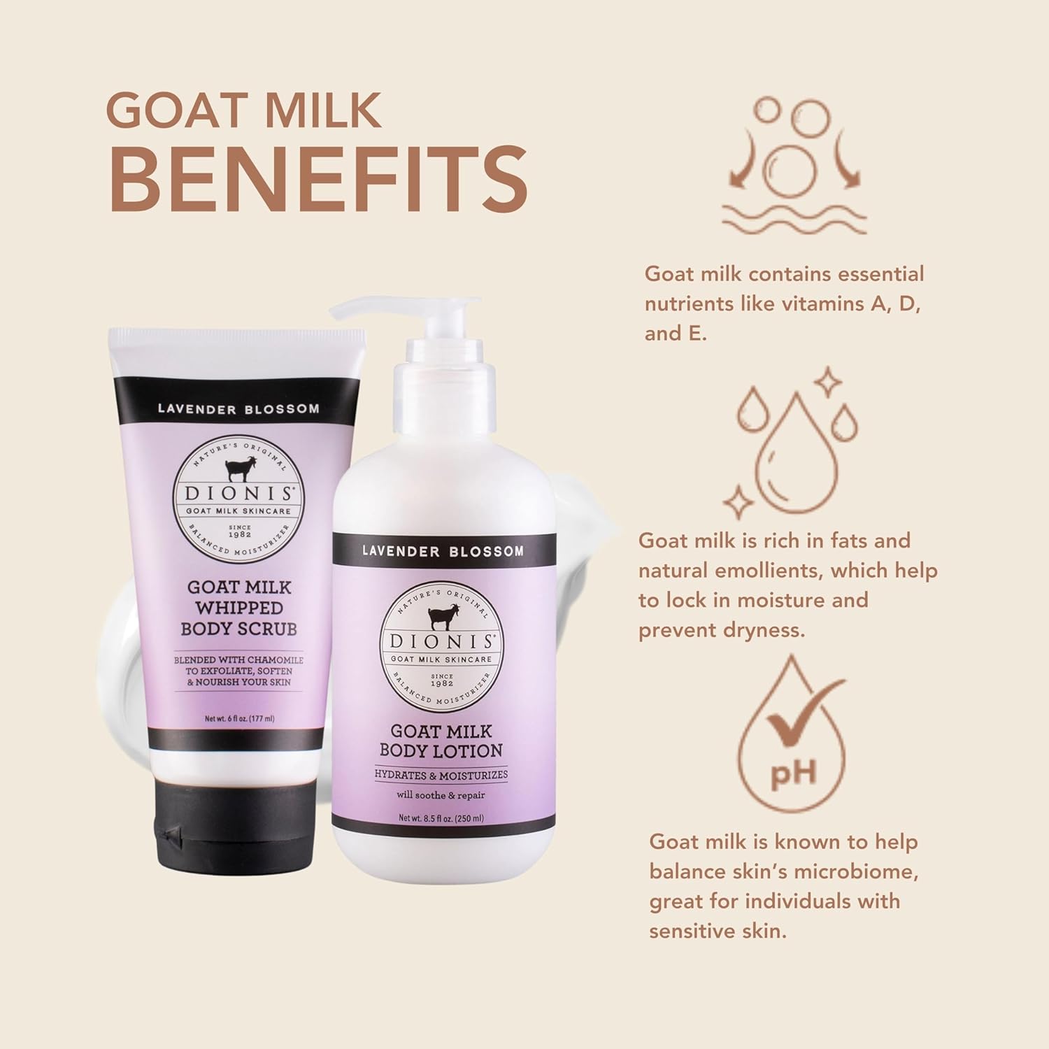 - Skin's Best Friend - The Dionis goat Milk Skincare Lotion is rich and creamy. With regular use itâs designed to ease rough skin, making it smooth and silky. It also does not leave a greasy residue like many lotions, so you can apply it right before putting on your favorite sweater.