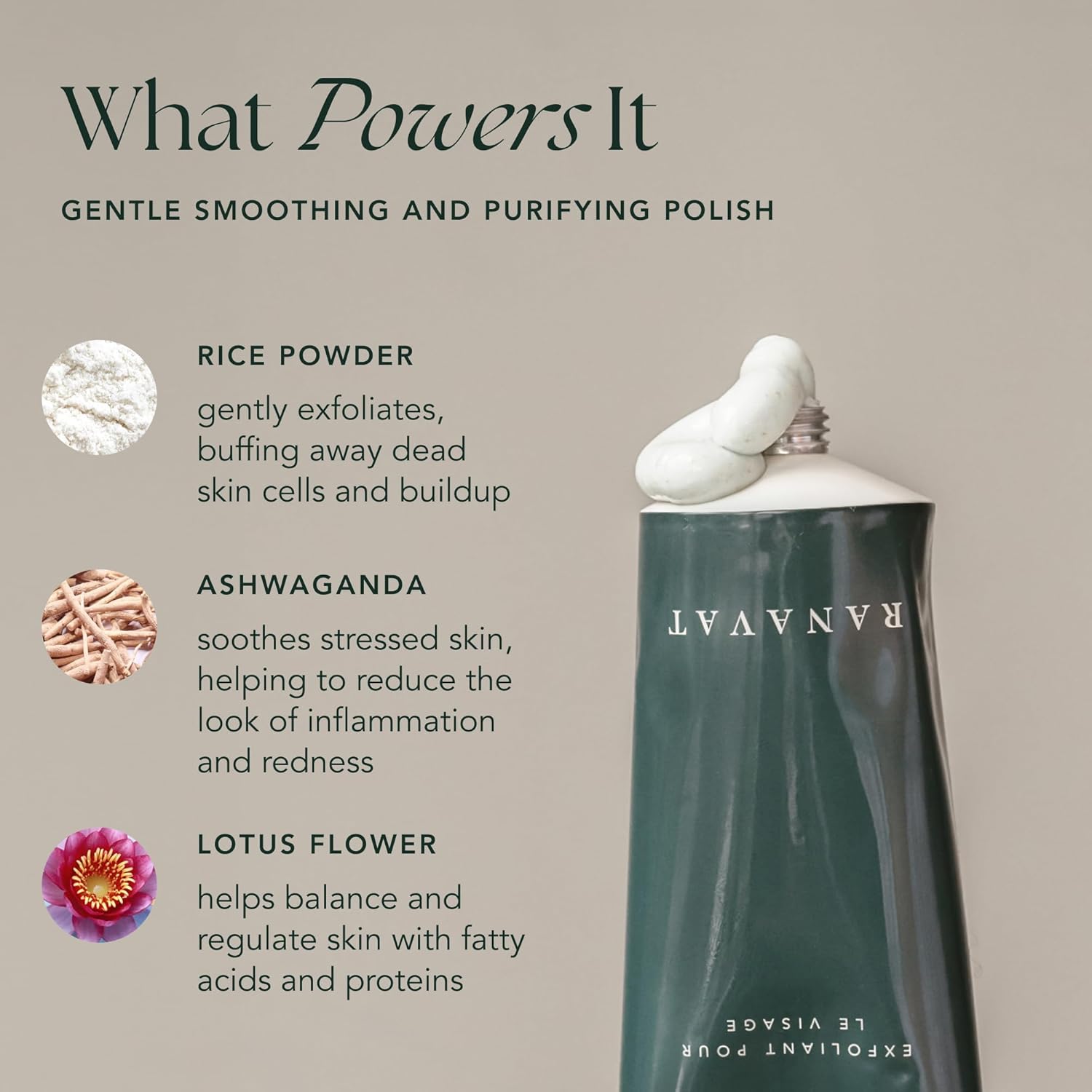 - Reviving Facial Exfoliating Scrub - A glow-inducing face exfoliator that effectively buffs away dead skin cells, uneven skin texture, and impurities with a blend of brightening rice powder and repairing ashwagandha.