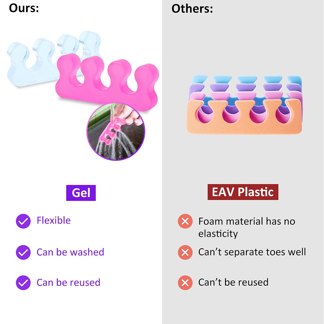 - đšăReusable, easy to cleanăToe Separators for Pedicurecan be cleaned repeatedly,and jelly material that can be used multiple timesis not easy to deform.Upgraded version of Foam pedicure toe separator.Rinse once with water before use.ăServiceăWe love our customers,If you are troubled by product problems,please contact us as soon as possible to solve it for you,including return or exchange.