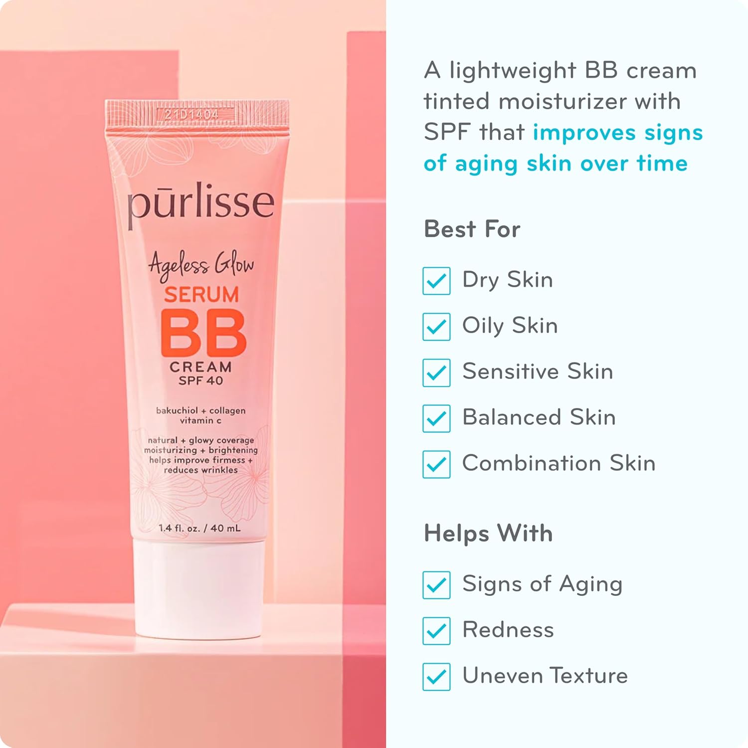 pūrlisse Ageless Glow Serum BB Cream SPF 40 - Glow BB Cream with SPF Enriched with Bakuchiol & Vitamin C to Help Improve Firmness & Reduce Wrinkles for Dewy Skin - Fair (1.4 oz)