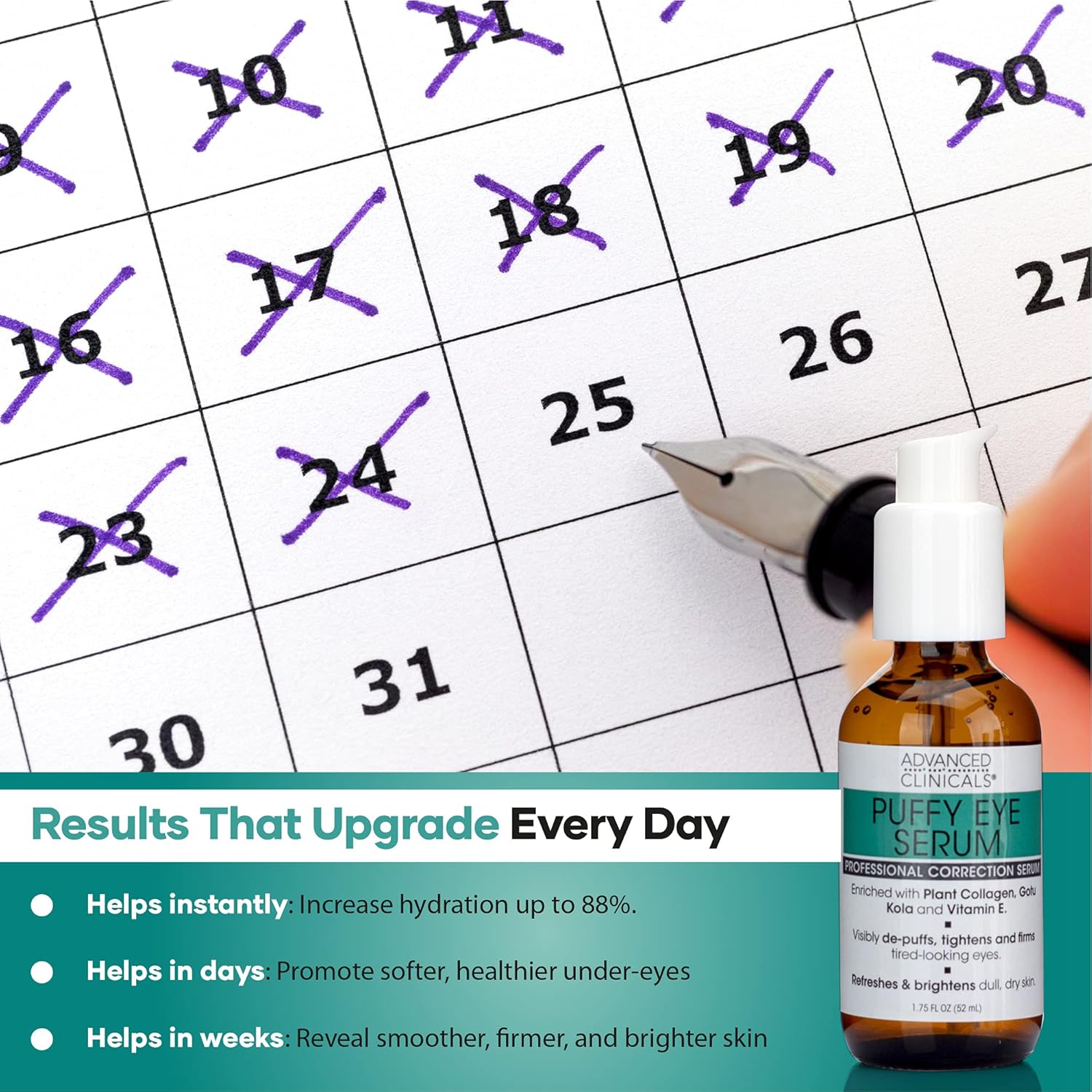 Advanced Clinicals Puffy Under Eye Face Serum Anti Aging, Brightening, & Firming Serum W/Vitamin E, Collagen, Gotu Kola, Caffeine, & Green Tea Helps Hydrate & Calm Puffiness, 1.75 Fl Oz