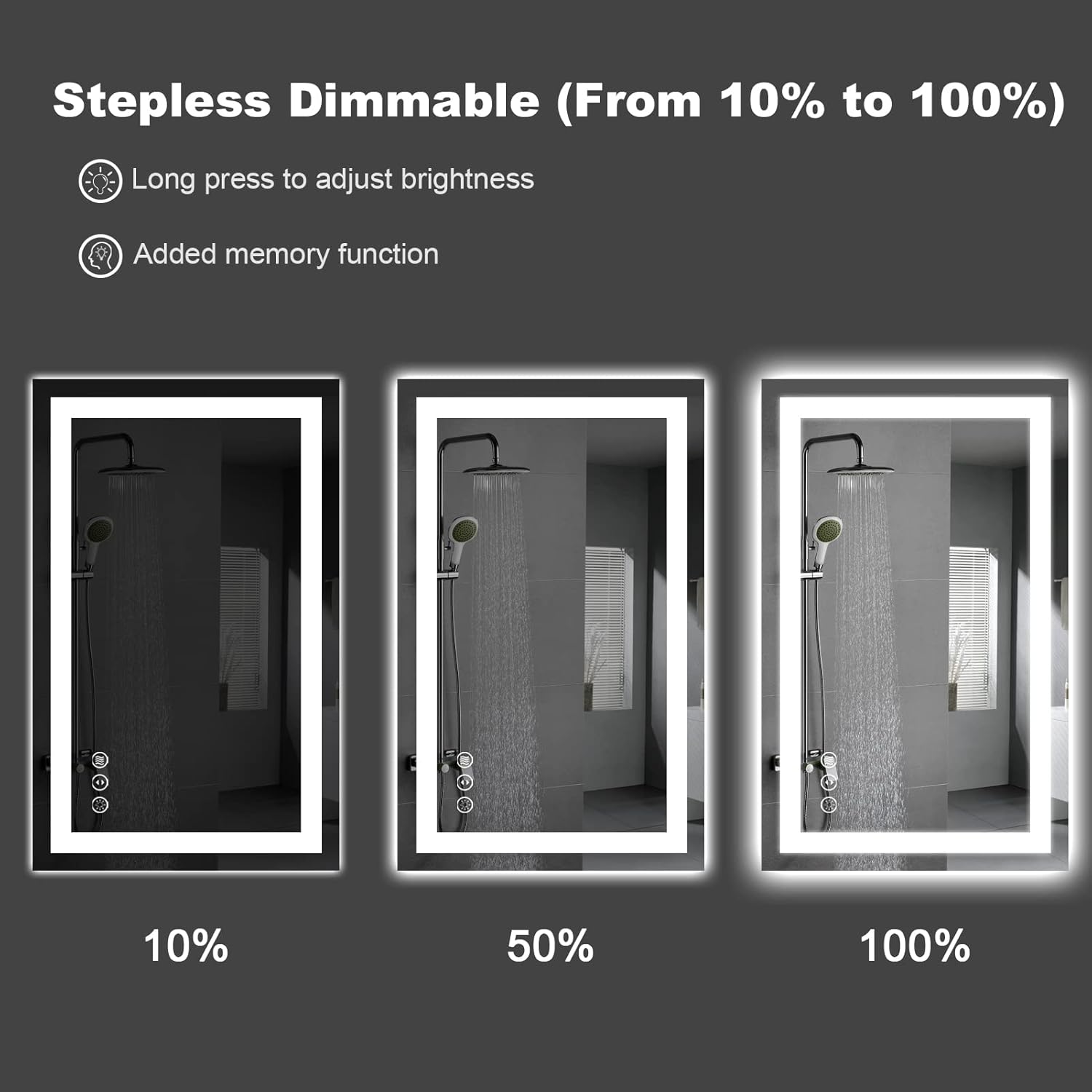 - [Anti-fog]: After a few minutes of opening the defogger, the heater in the mirror will disperse the fog from the center to sides, the mirror will still reflect clearly in the bathroom surrounded by hot air; It will turn on with the power on and automatically turns off after 1 hour