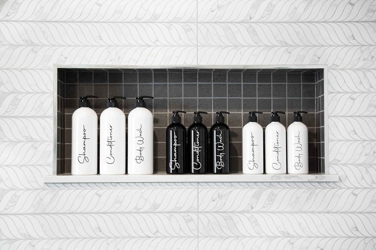 - FUNCTIONAL SHOWER ORGANIZATION - Bring classy style and seamless organization to your cluttered shower with 3 empty pump bottles for shampoo, conditioner and body wash. Perfect for home or commercial use in the hospitality industry. Exquisite and refined.