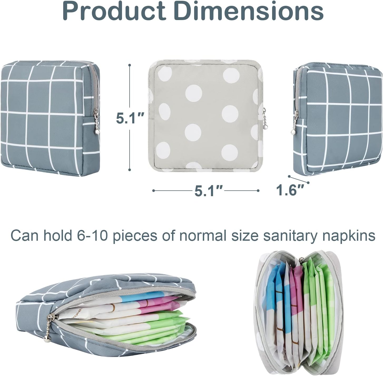 - đăMeet Your Day's Needsă- The size of the period pads bag is 5.1*5.1*1.6 inch, it can hold 6-10 pieces of normal size sanitary napkins. The compartment design inside the menstrual pad bag is easy to store tampons and Keep them clean and orderly. It can be easily put in your backpack or handbag.