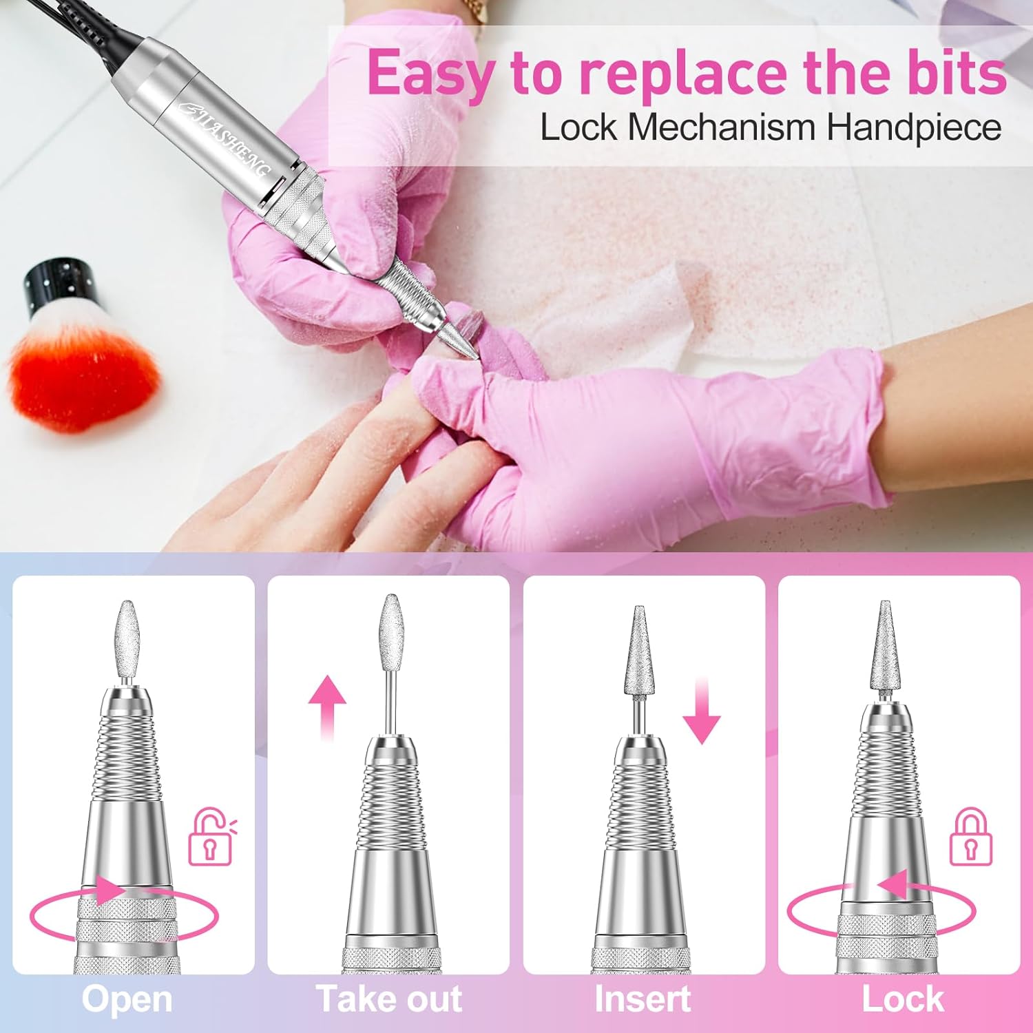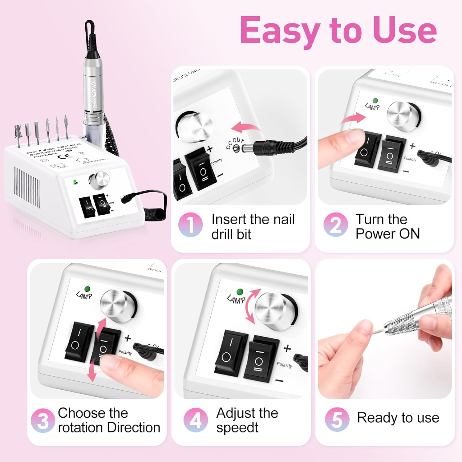 - Compact Electric Grinding File:Nail drills for acrylic nails are compact enough for your desk, our nail drill machine designed with 6 nail drill bits holder and hand piece holder, it is more convenient for your manicure and pedicure