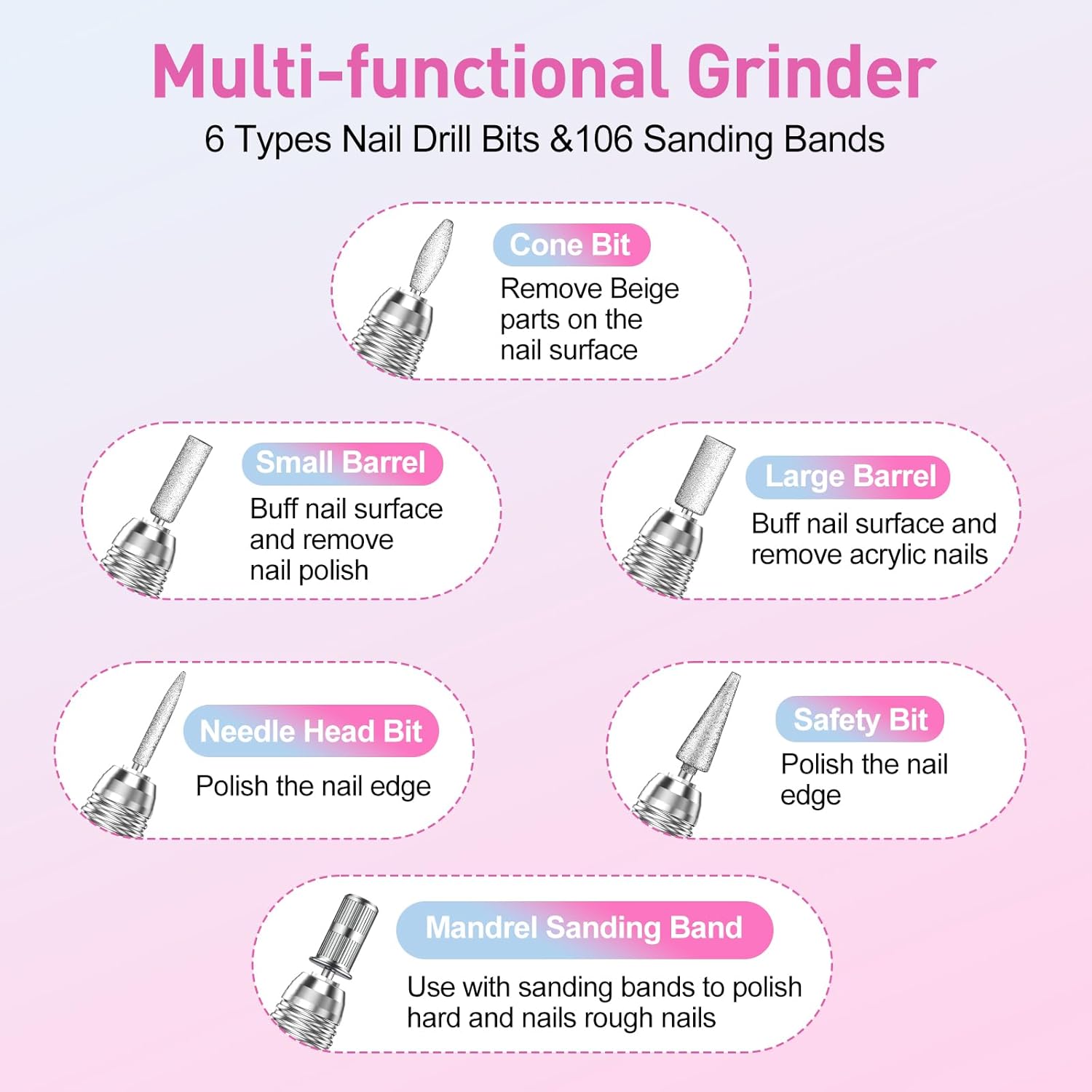 - Practical Acrylic Nail Kit: Electric nail file equipped with 6 nail drill bits and 100pcs sanding bands, meet all your demands for acrylic gel nails, dip powder nails and poly nail gels, works effective for polishing, shaping and removing