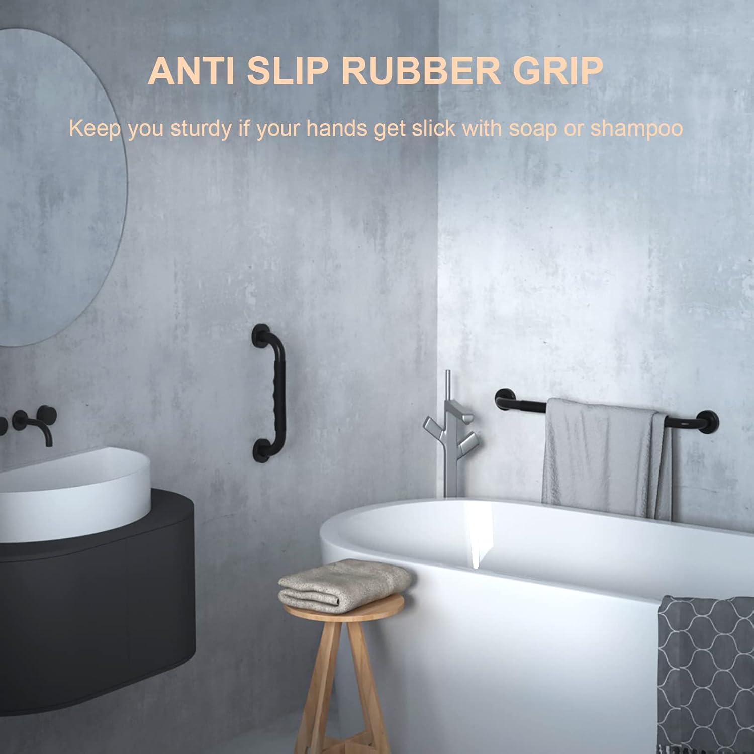 - The special design like the grip portion as it keeps you sturdy if your hands get slick with soap or shampoo. We provide a Anti-Slip Silastic Soft circle around the non-slip grab bars, which safe and comfortable to use. The surface design skidproof is stronger than other styles. Concealed screw in design allows for easy, secure installation at any angle, allows you to cover any unsightly screw holes and continue a clean, sleek trend to your bath and shower.