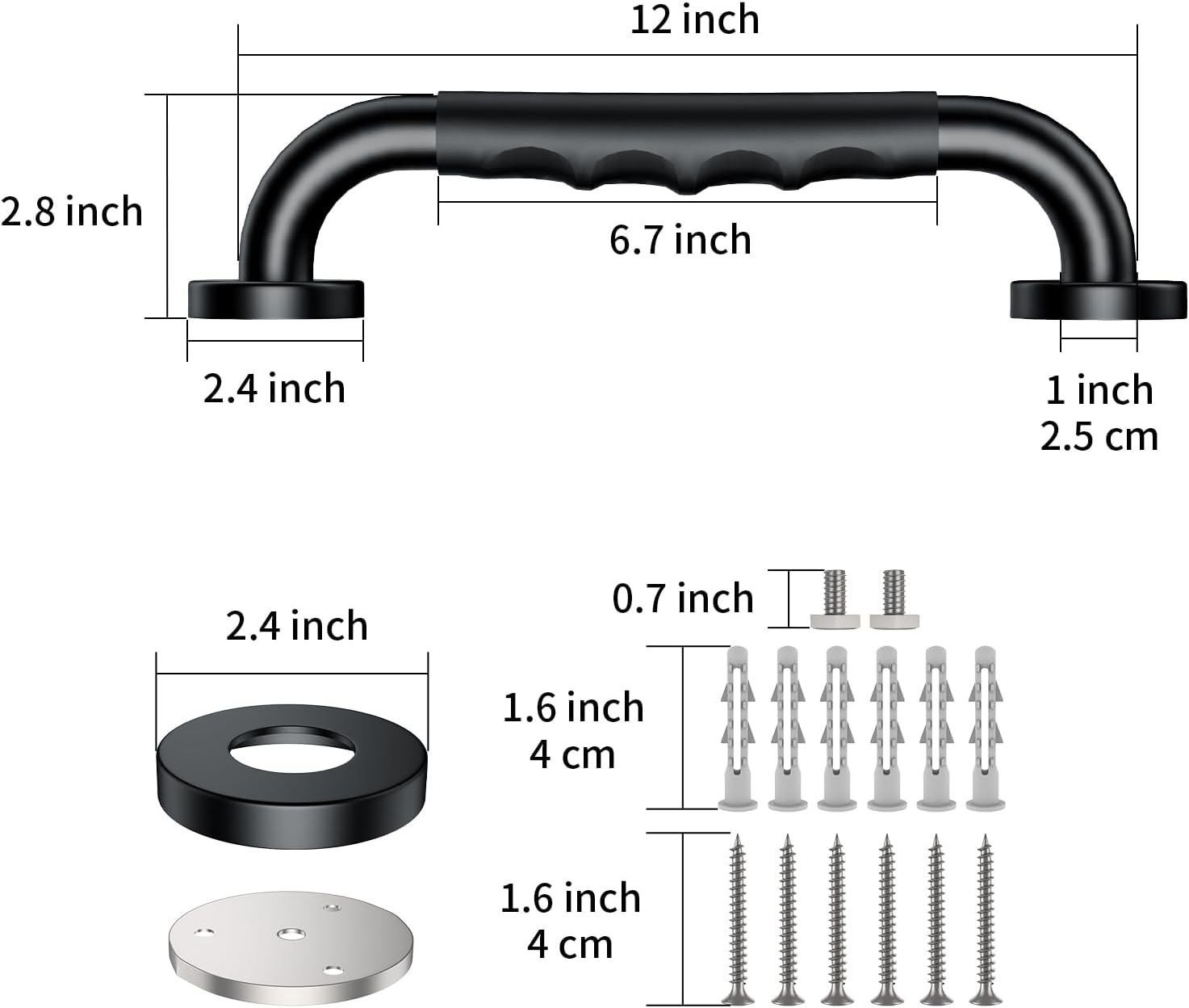 - ZUEXT 2 Pack 12 Inch 1" diameter SUS304 Stainless Steel Oil Rubbed Black Shower Grab Bars with non-slip soft rubber grip; Our anti-slip shower grab handle bar features a convenient design, it come with the mounting screws and anchors for easy installation.