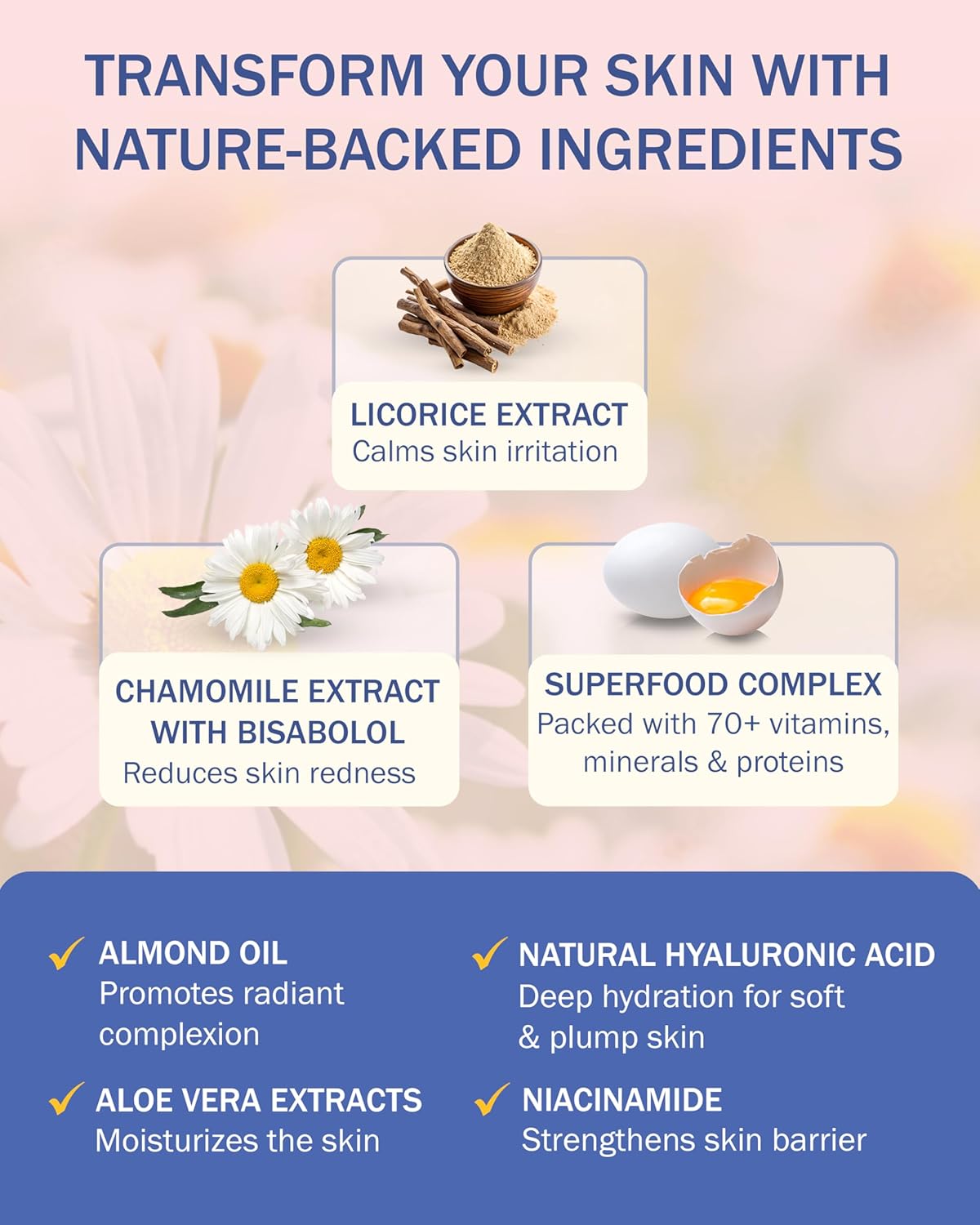 - Potent Natural Ingredients: Infused with licorice, chamomile extracts, aloe vera, and hyaluronic acid, our dry face moisturizer restore and strengthen the skinâs natural barrier for a lasting hydration and protection.