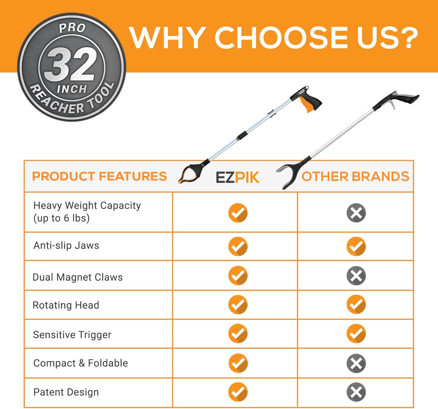 - Lightweight Extended Grabber Reacher Tool: This Picker Upper Grabber Tool by Ezpik is Designed with a Keen Focus on User Comfort and Convenience. Long Grabber Weighing in at 10 Ounces, Additionally, its Pick Up Sticks Foldable Design Ensures Easy Portability, Making it an Ideal Choice for Elderly Individuals who may Require Assistance in Reaching Items without Straining their Wrists.