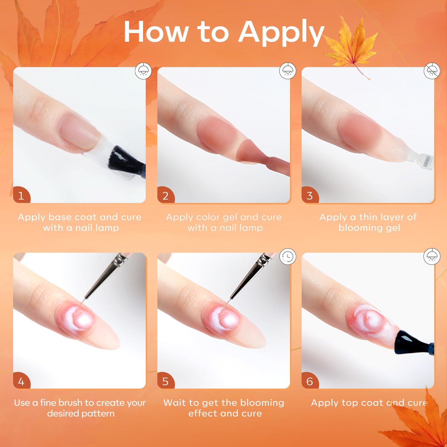 - One Bottle Get All DesignďźThe clear blooming gel can apply with any color gel, easy to create a stunning blooming effect. Apply blooming gel before color gel, then use nail art brushes to create your own fun, fancy, and elegant manicure in seconds.