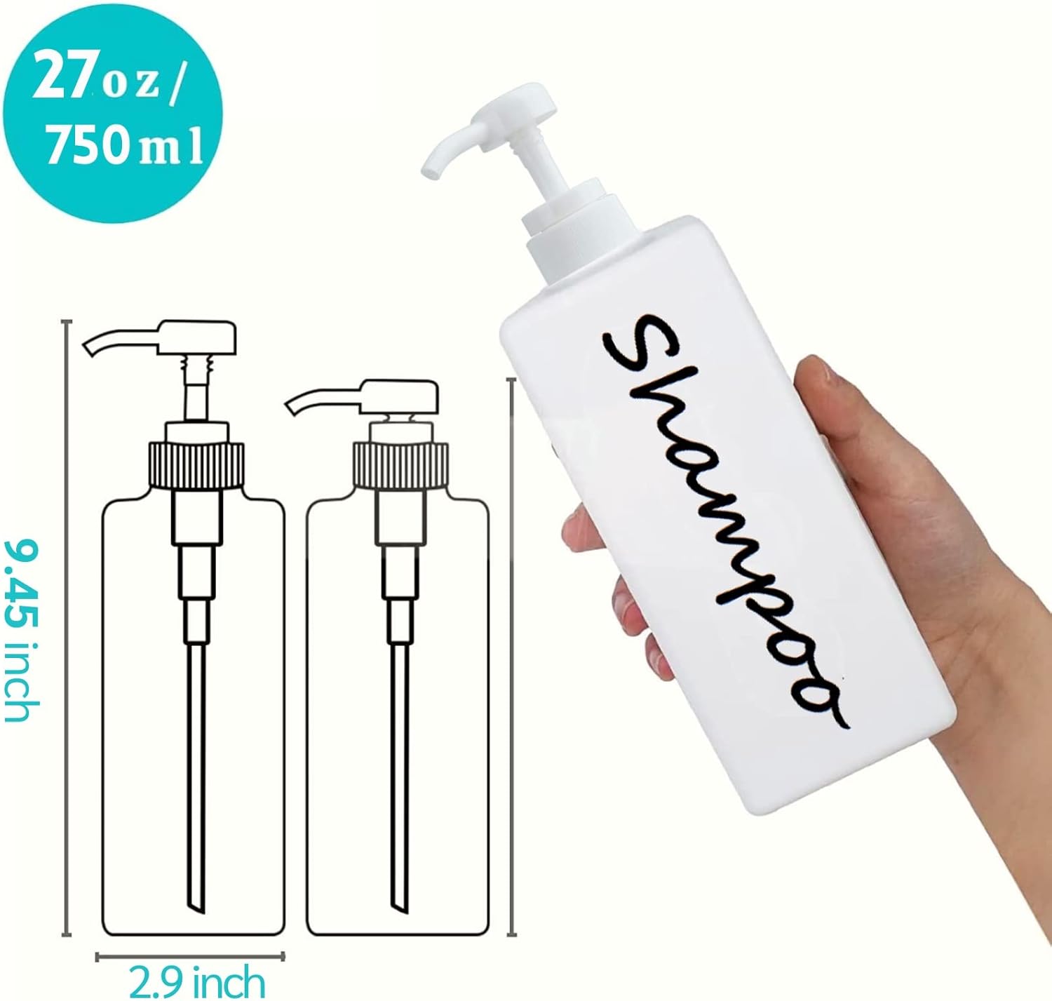 - Including: 1 × pump bottle with ''Shampoo'' font; 1 × pump bottle with ''Conditioner'' font; 1 × pump bottle with ''Body wash'' font; 1 × packing box
