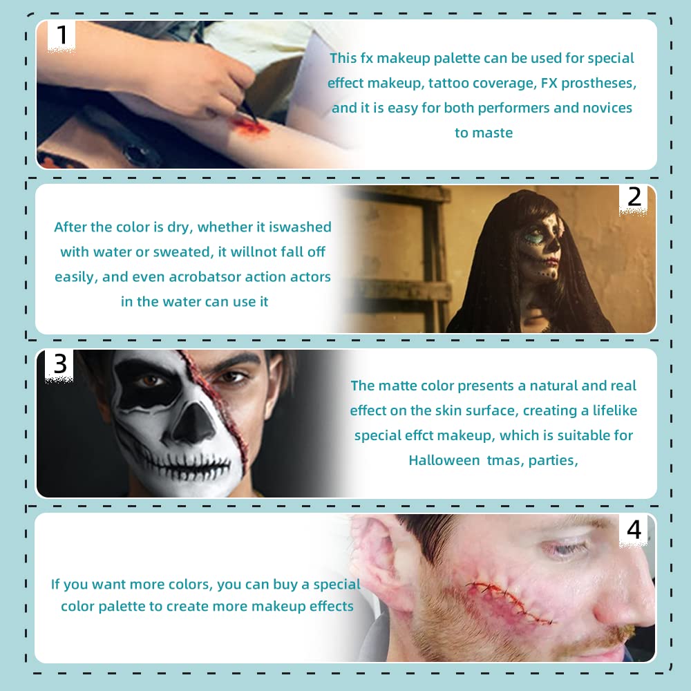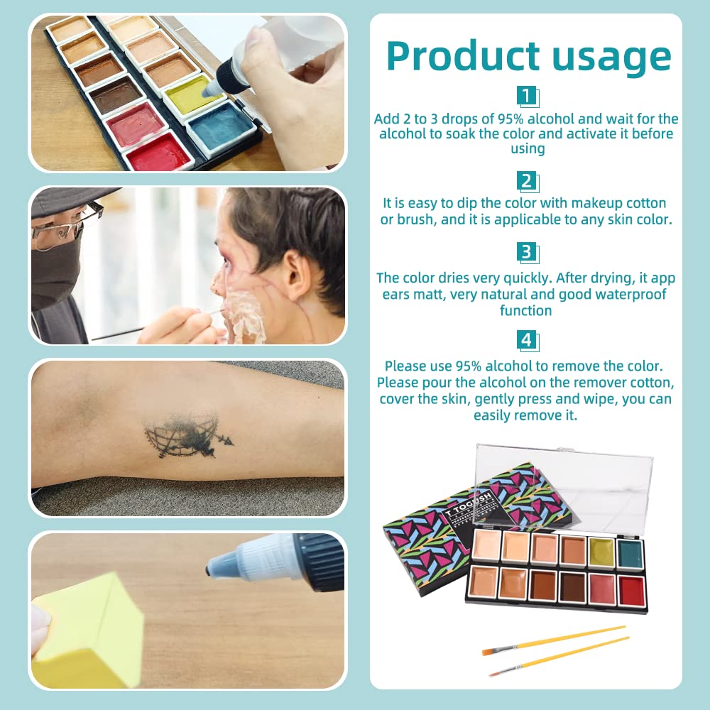 - 【Application】It can be used for special effect makeup, tattoo coverage, FX prosthesis, and it is very easy to master whether it is a performing arts worker or a makeup beginner. You only need to drop a few drops of alcohol in the paint grid before each use and wait for it to soak in, then you can paint with a paintbrush or cotton pad. After it dries, it will not fall off easily whether it is washed with water or sweated, so even in the Acrobats or action actors in the water can be used.