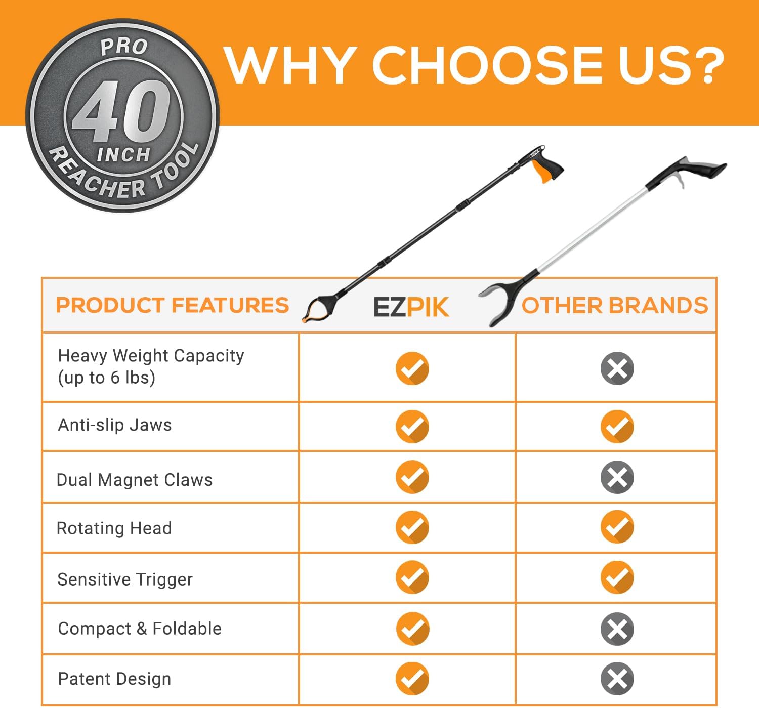 - Foldable Grabber Reacher Tool: The Ezpik Folding Grabbers Heavy Duty Tool is a Highly Portable, Folding Long Hand Grabber to a Compact 16 Inches - Making it a Convenient Companion Anywhere You Go.