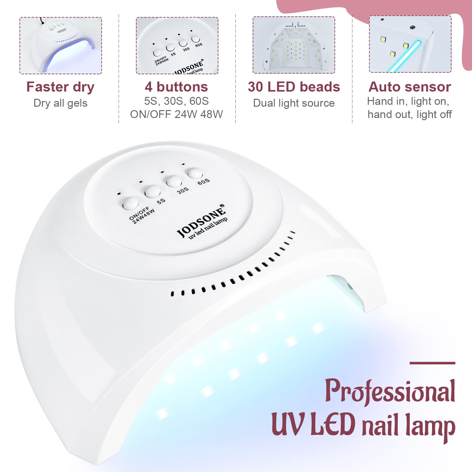 - Fast Curing Nail Lamp: This manicure lamp has three cure modes, namely 5S, 30S and 60S. Generally, the cure mode can be selected according to the dosage of gel nail polish, or according to your own suitable mode.