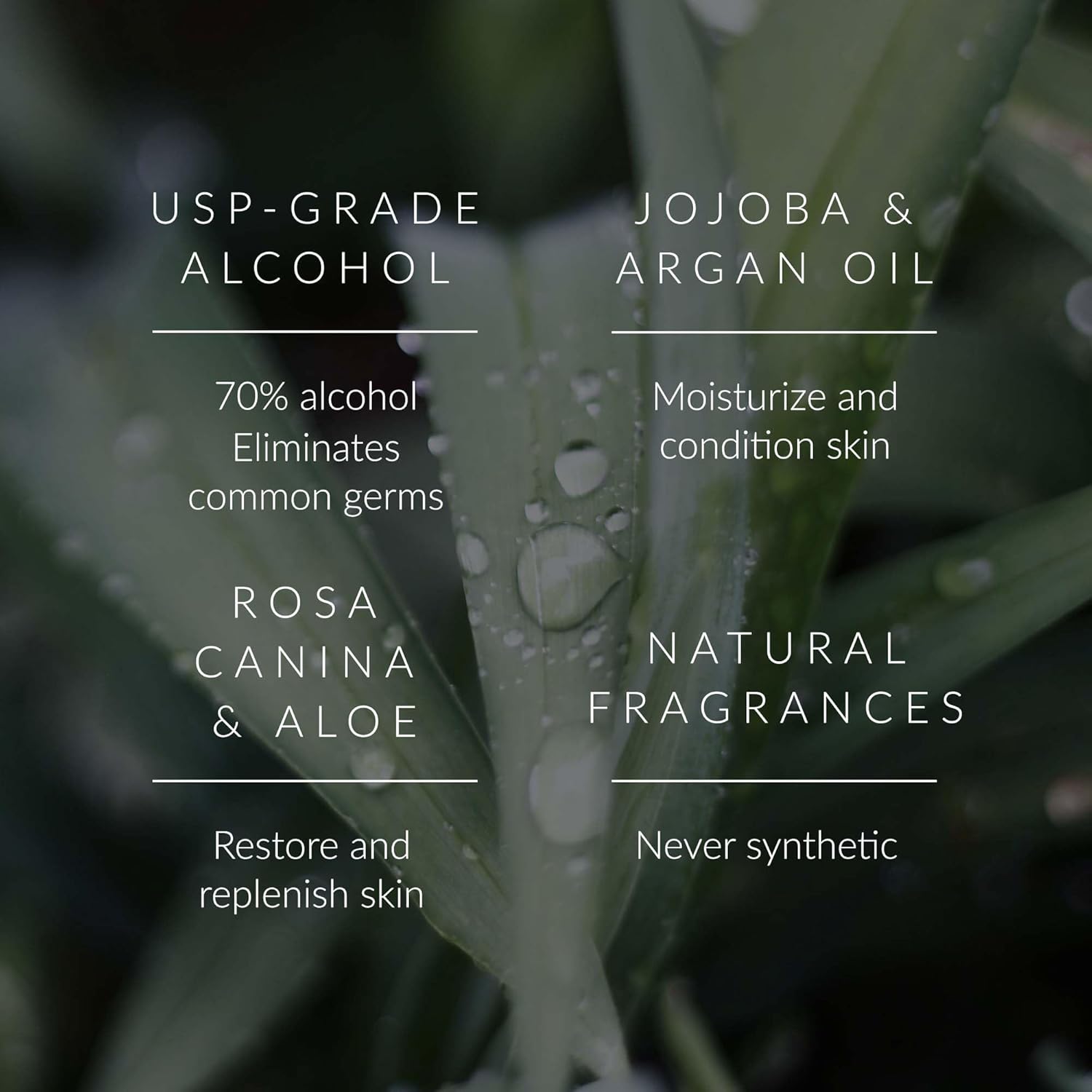 - MOISTURIZING, NON-STICKY SPRAY: 70% sugarcane-derived alcohol plus Jojoba, Argan, Rosehip, and Coconut oils. This hand sanitizer spray bottle is effective against common bacteria while keeping hands soft, not dry or sticky, and works perfectly as a travel size hand sanitizer.