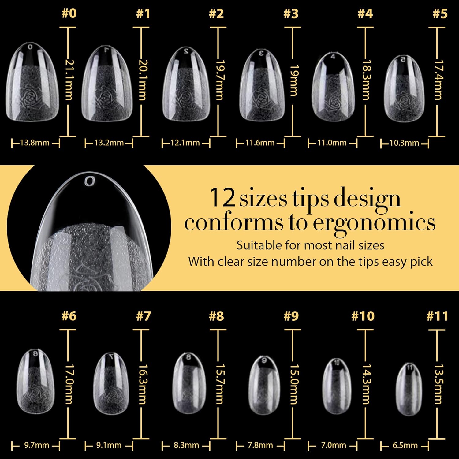 - ❤️12 Sizes Nail Tips : Short round nail tips clear with 12 sizes are suitable for all kinds of nail satisfying various needs. Made with perfect length and thickness. And 2 extra size can suit bigger or smaller nails, in case 10size can not fit few of your nails