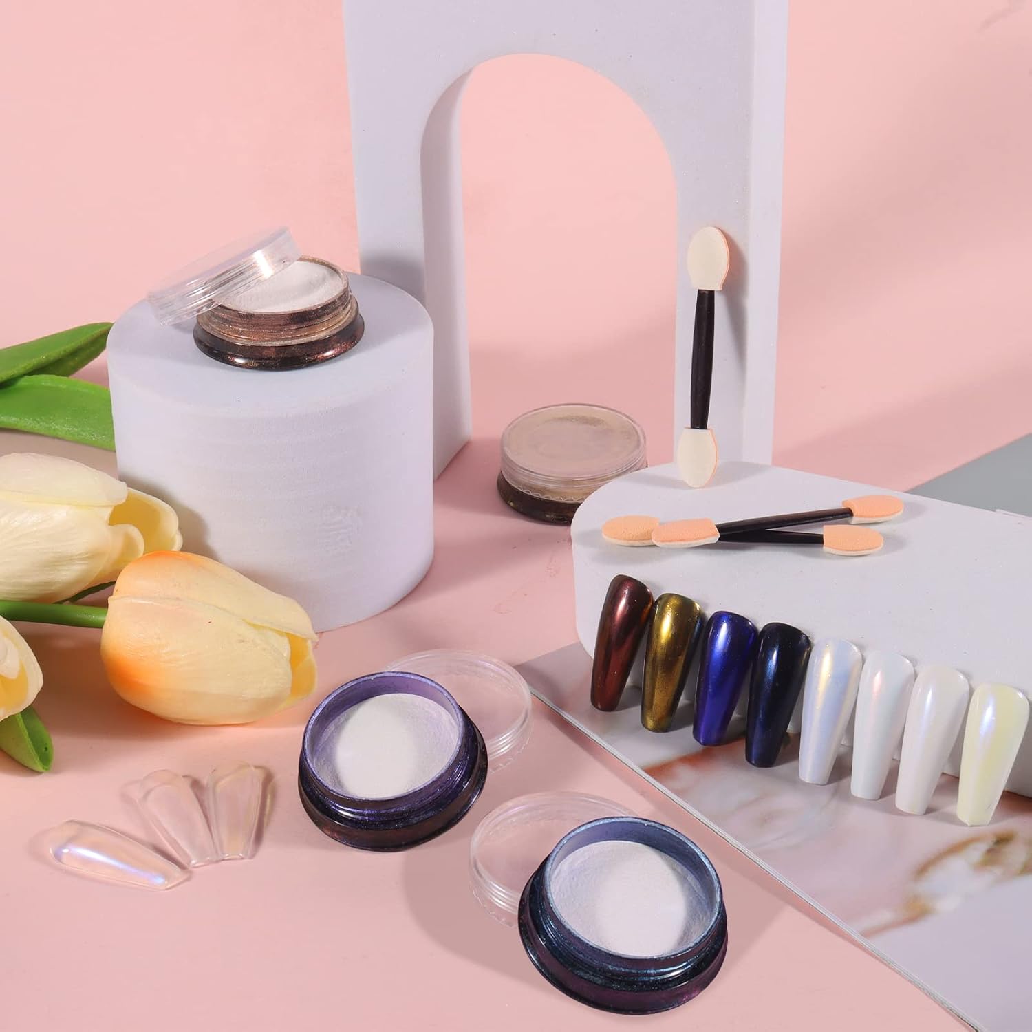 - 4 Pretty Colors: 4 Pretty Colors: A package has 4 colors of iridescent pigment powder for nails and 4 Pcs two-ends eyeshadow sponge applicator. The luster from these 4 colors pigment powder is violet blue sheen, milk chocolate sheen, demin blue sheen, and gold sheen. Each color is 1g, expected to be applied to 300pcs nails, and packed in a delicate clear jar.
