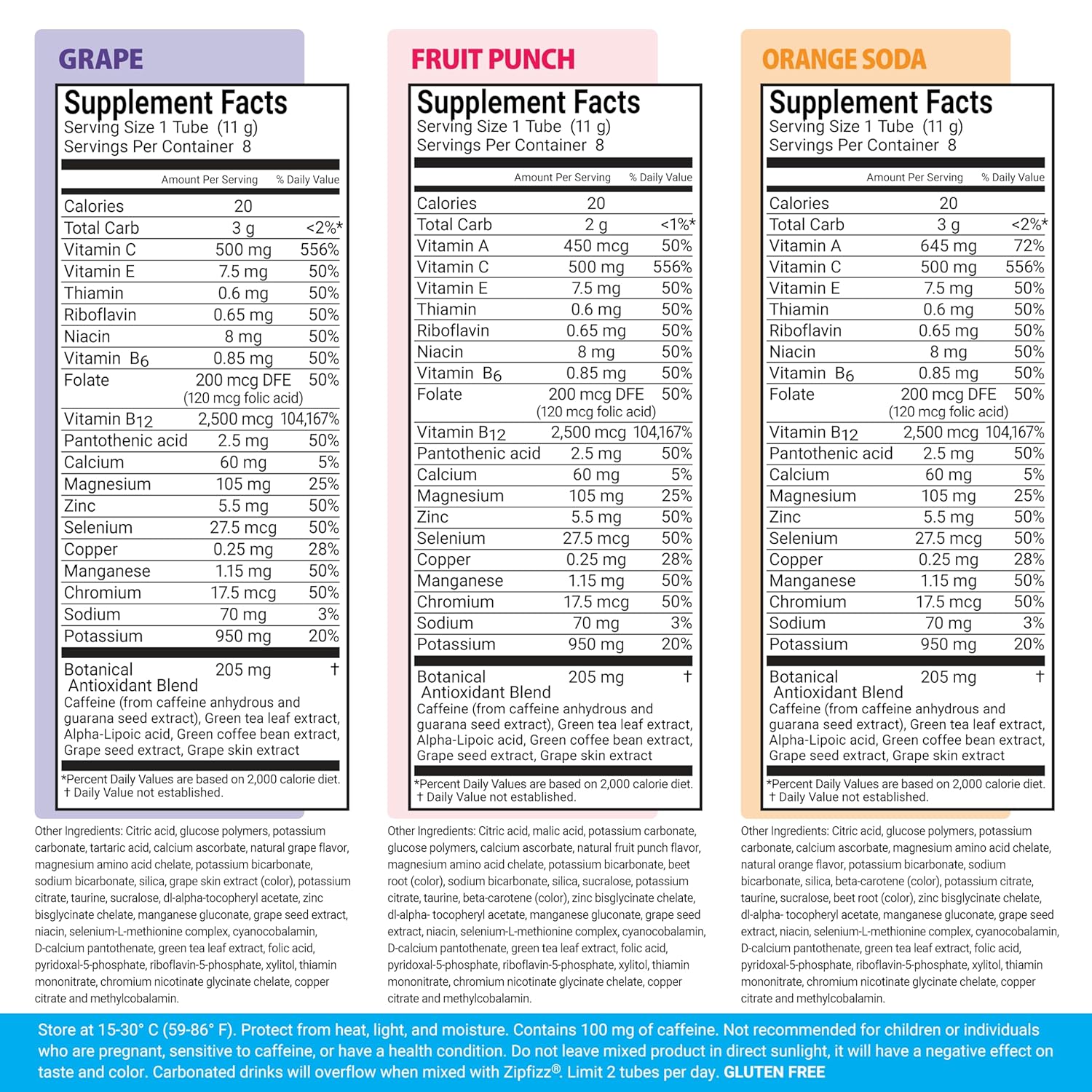 - Combo Pack – This pack contains 8 tubes each of Grape, Orange Soda, and Fruit Punch. Simply add Zipfizz powder to 16-20 ounces of water or other non-carbonated beverage, shake, and enjoy!