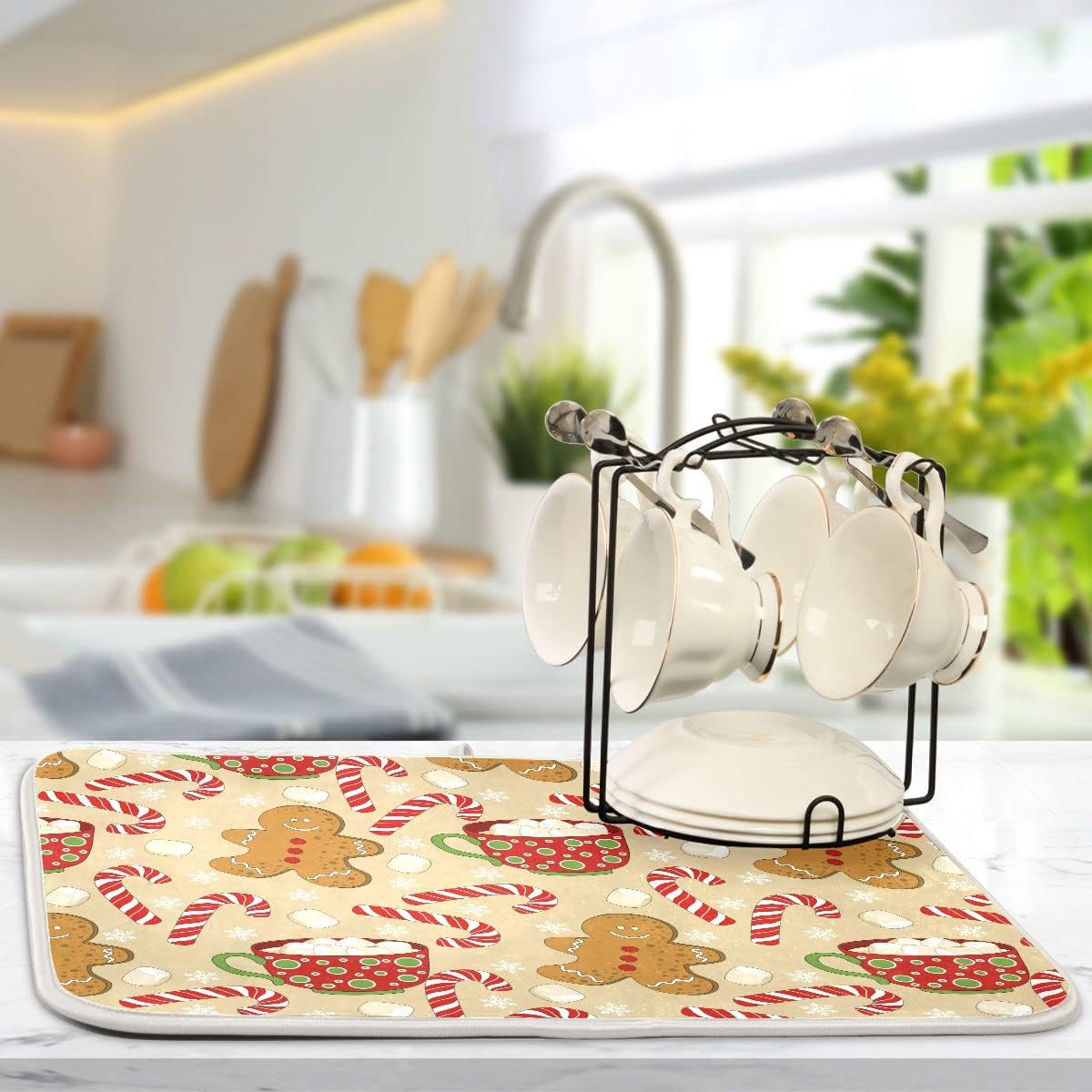 Christmas Gingerbread Man Candy Cane Dish Drying Mat for Kitchen Winter Snow Snowflake Snowman Xmas Microfiber Drying Mats Absorbent Reversible Dish Pad Medium Dish Draining Mat 16x18 inch