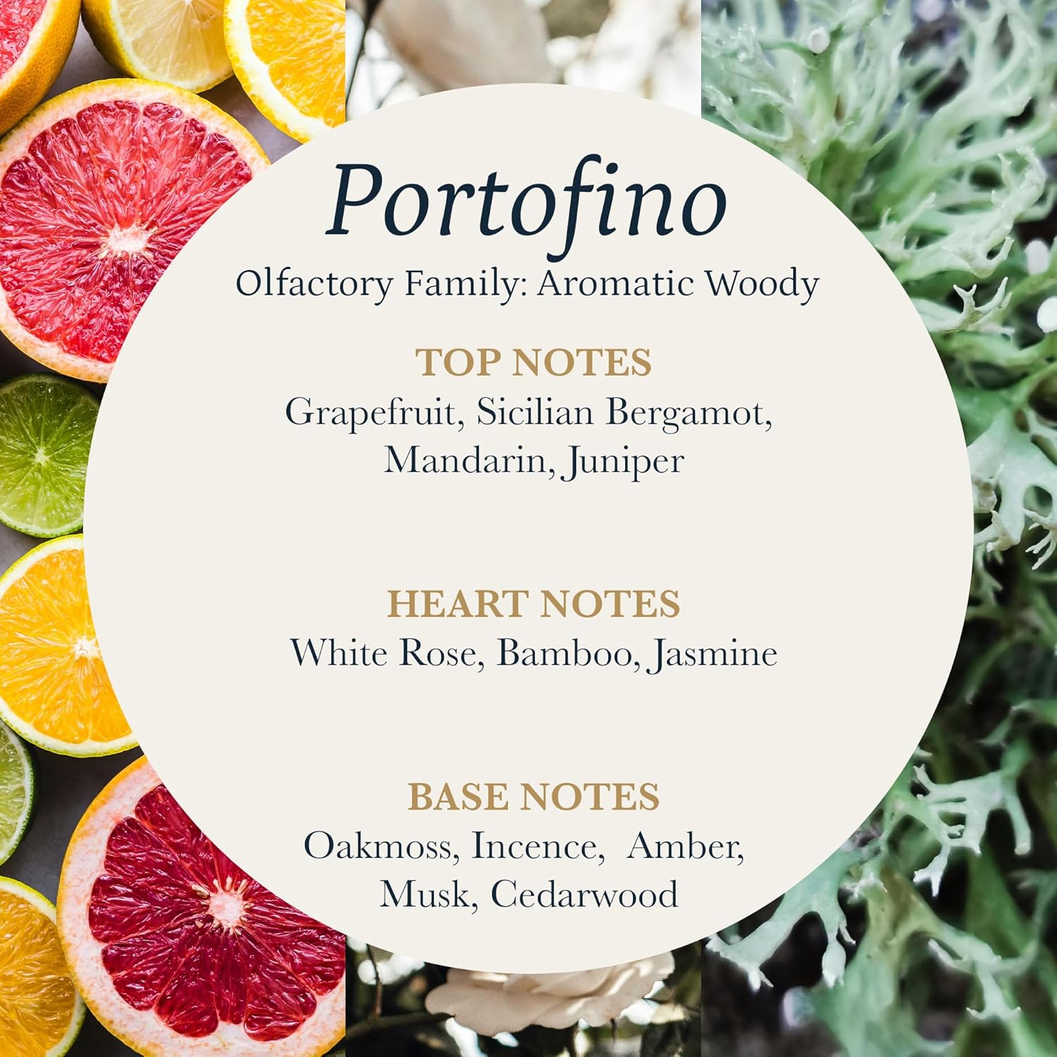 - Luxury scent experience: a citrus morning wakes up giving you the energy of newness, opening your eyes to the bright day. then the light settles in a firm presence for you to inhabit and conquer. and finally, when all is done, the earthy shadows whisper that you can rest. live a full life cycle in a minute with the perfectly rounded fragrance of portofino.