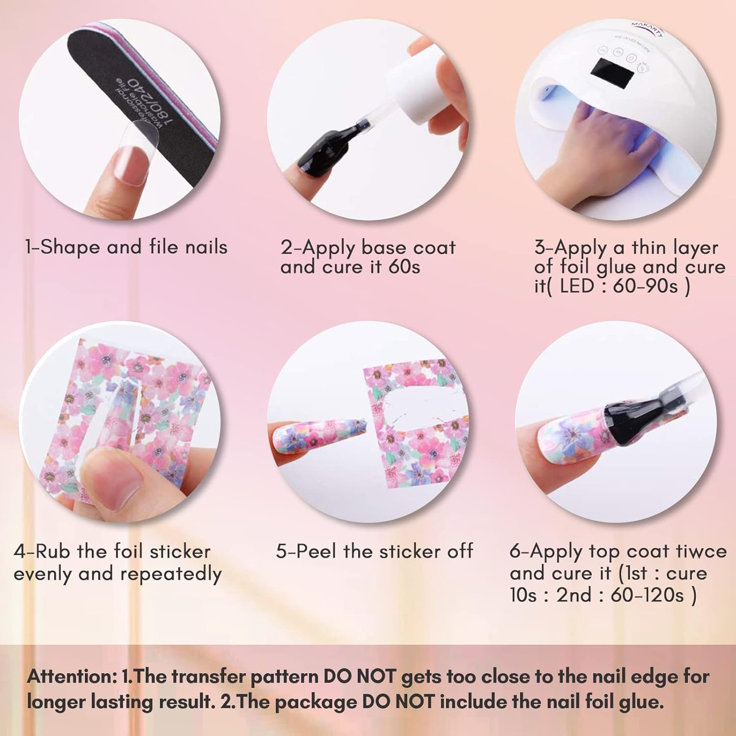 - Easy to Apply & Remove: To apply: press the foil on nails after applying nail foils glue(nail lamp needed). To Remove: easily with nail polish remover or nail drill. Note: Please distinguish the Front and Back of Stickers.