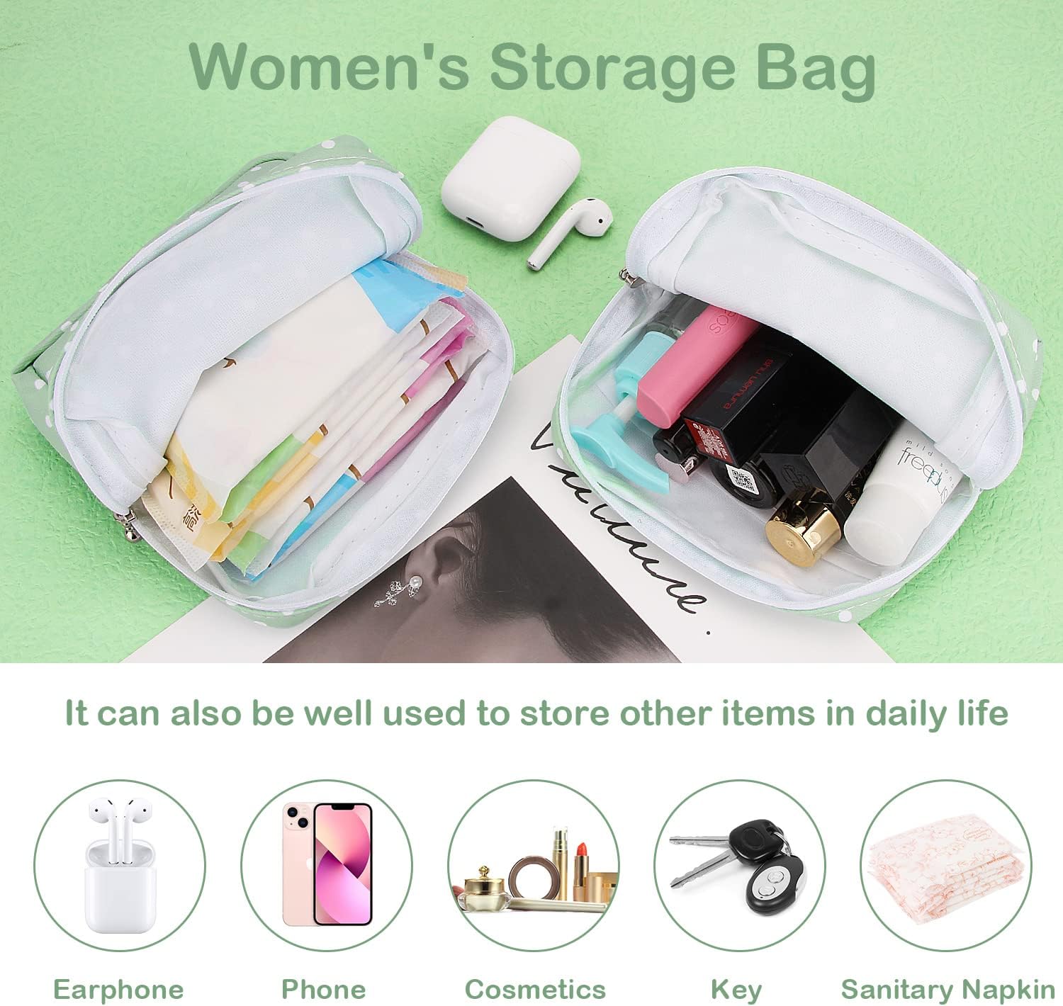 - đ ăMultifunctional Zipper Pouchă- Our women's storage bag can not only store feminine products but also store little items such as lip balms, lipsticks, cosmetics, mini mirrors, jewelry, keys, cash, credit cards, travel first aid stuff, etc.