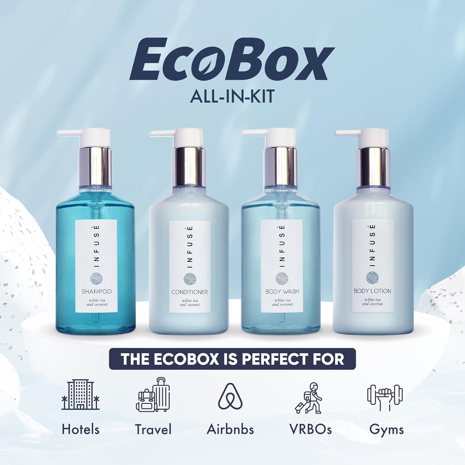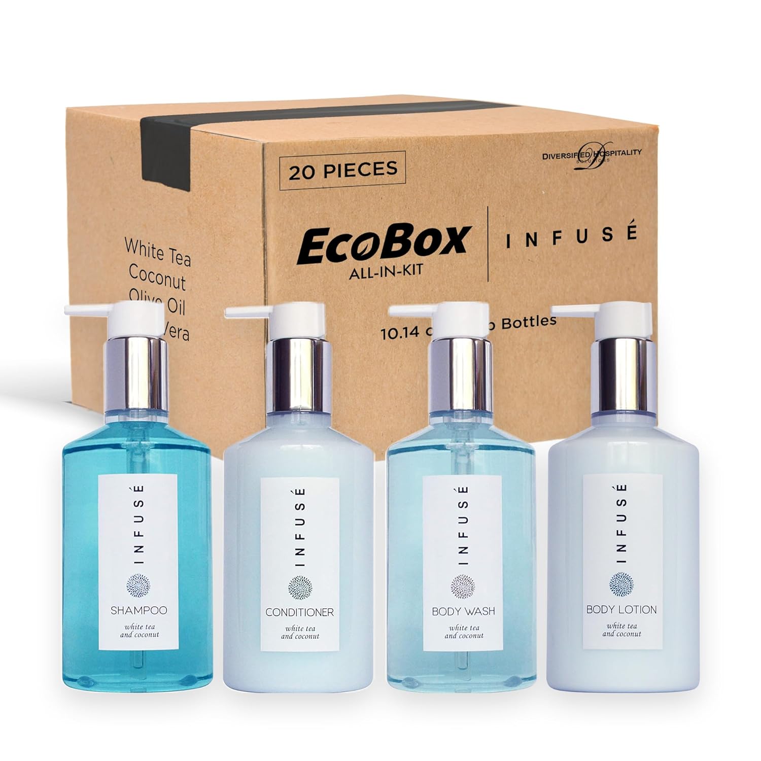 A 20 Piece Ecobox All-In-Kit of our Infuse | White Tea and Coconut Soap | 6 Shampoo, 4 Conditioner, 6 Body Wash & 4 Lotion | 10.14 oz Hotel Soaps and Toiletries Bulk | Personal Care Products